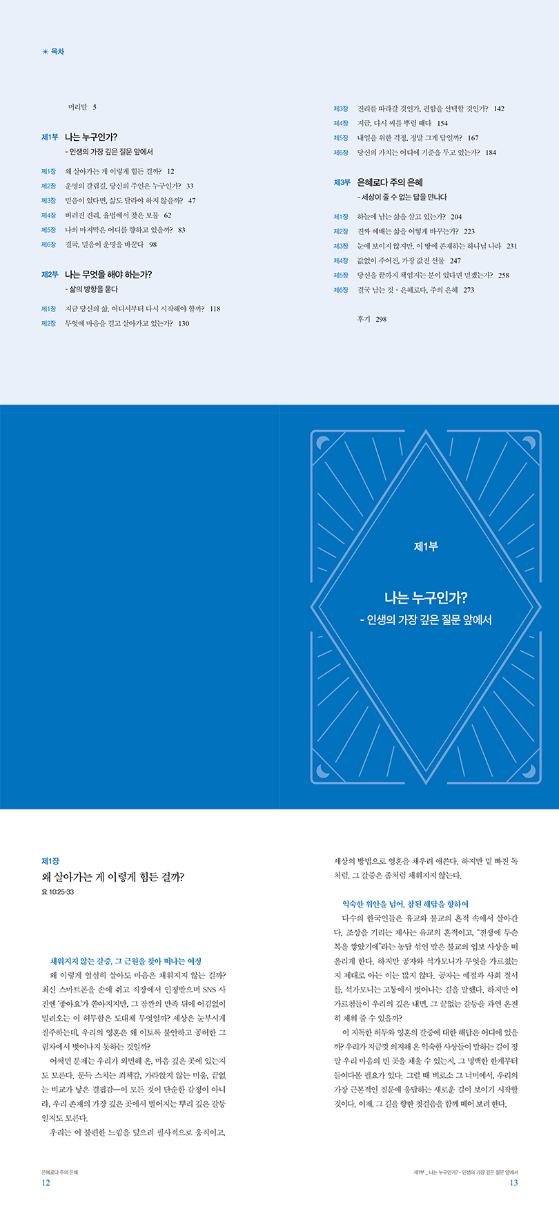 이 책은 그런 질문을 외면하지 않고, 말씀 속에서 길을 찾고자 하는 이들을 위한 따뜻한 길잡이다. 설교문 형식을 벗어나 칼럼처럼 부드럽고 정직하게 써 내려간 글들은 독자의 마음 깊은 곳을 조용히 두드릴 것이다. 신앙의 연륜이 깊은 이에게는 처음 주님을 만났던 순간을 떠올리게 하고, 삶의 의미를 처음 묻기 시작한 이에게는 믿음의 첫걸음을 떼도록 이끌어 줄 것이다. 은혜로 다시 시작하는 여정에, 이 책은 함께 걷는 동반자가 되어 줄 것이다.