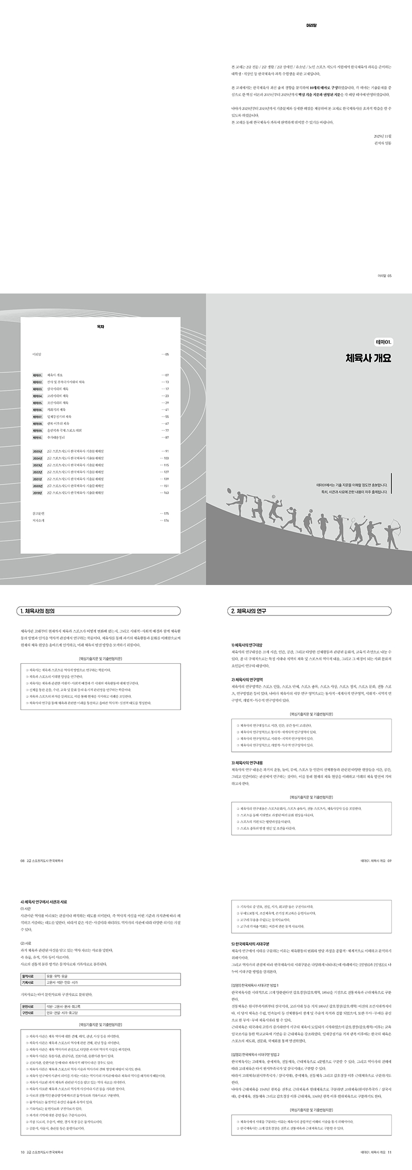 본 교재에서는 한국체육사 최신 출제 경향을 분석하여 10개의 테마로 구성하였습니다. 각 테마는 기출문제를 중심으로 한 핵심 이론과 2015년부터 2025년까지 핵심 기출 지문과 변형된 지문을 각 해당 테마에 반영하였습니다.