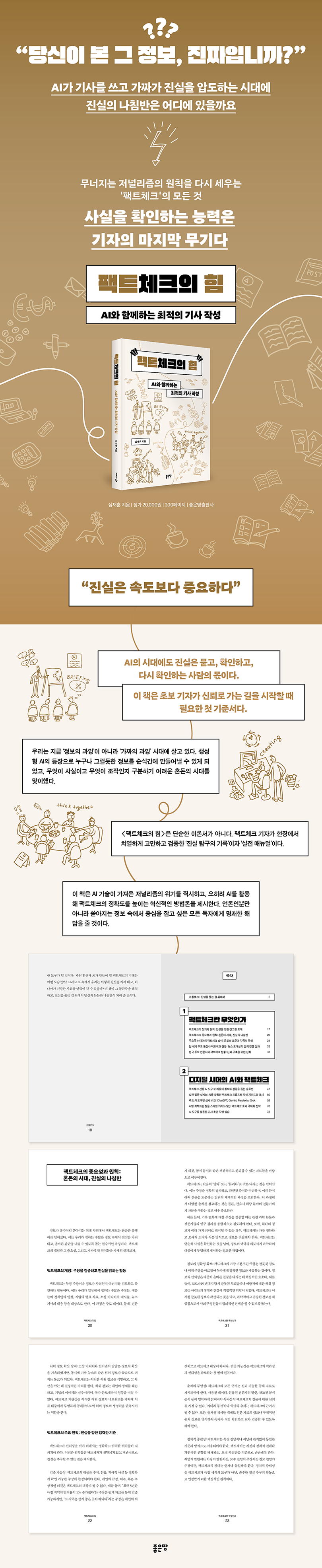 이 책은 디지털 시대를 맞아 언론과 AI가 결합된 팩트체크가 어떤 강력한 힘을 발휘할 수 있는지에 대한 해답을 제시한다. AI라는 최첨단 도구를 활용하되, 기존의 꼼꼼한 검증 과정을 곁들인다면 우리는 확증 편향의 덫에 빠지지 않고 현안의 진실에 한 걸음 더 다가설 수 있을 것이다.