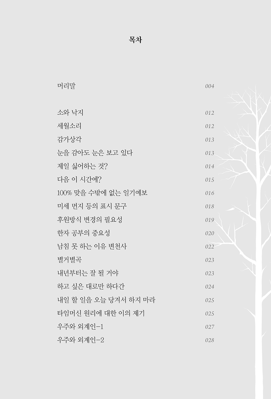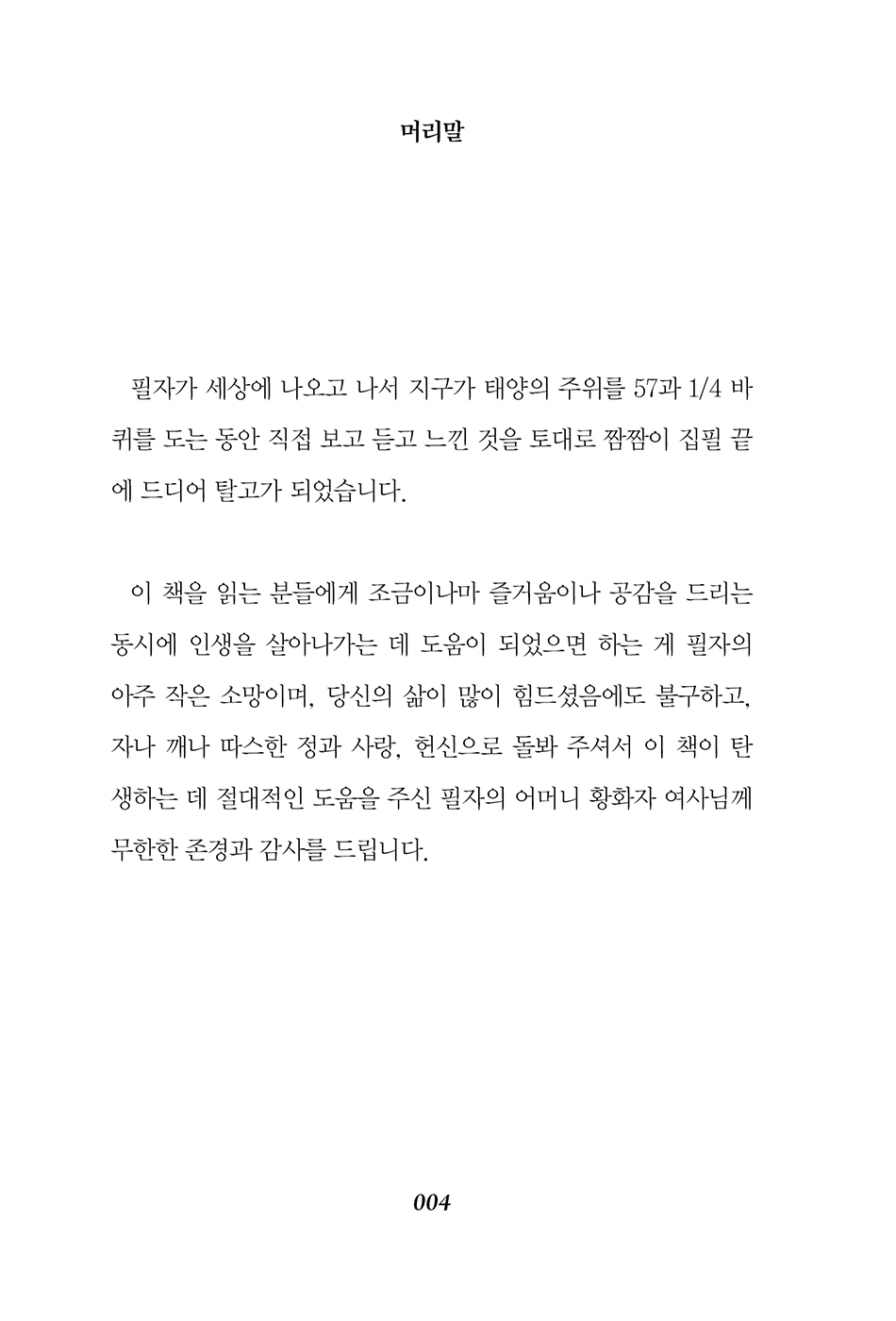이 책을 읽는 분들에게 조금이나마 즐거움이나 공감을 드리는 동시에 인생을 살아나가는 데 도움이 되었으면 하는 게 필자의 아주 작은 소망입니다.