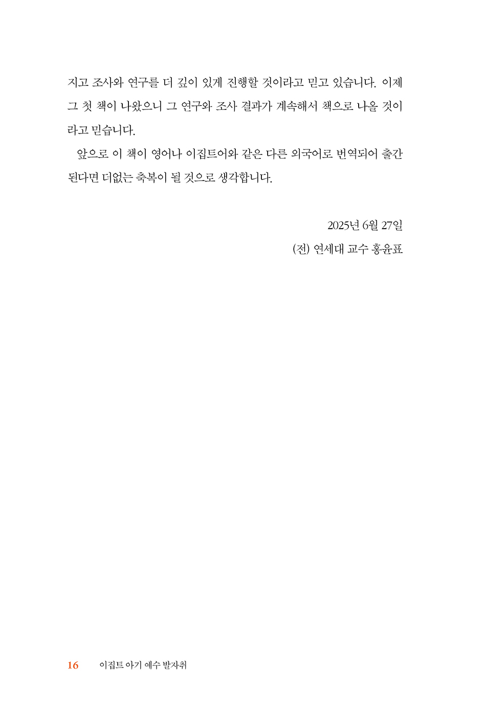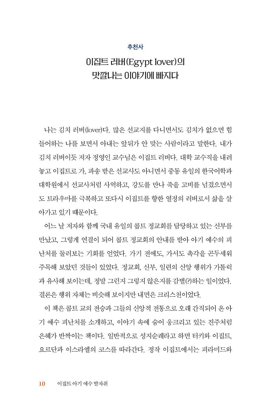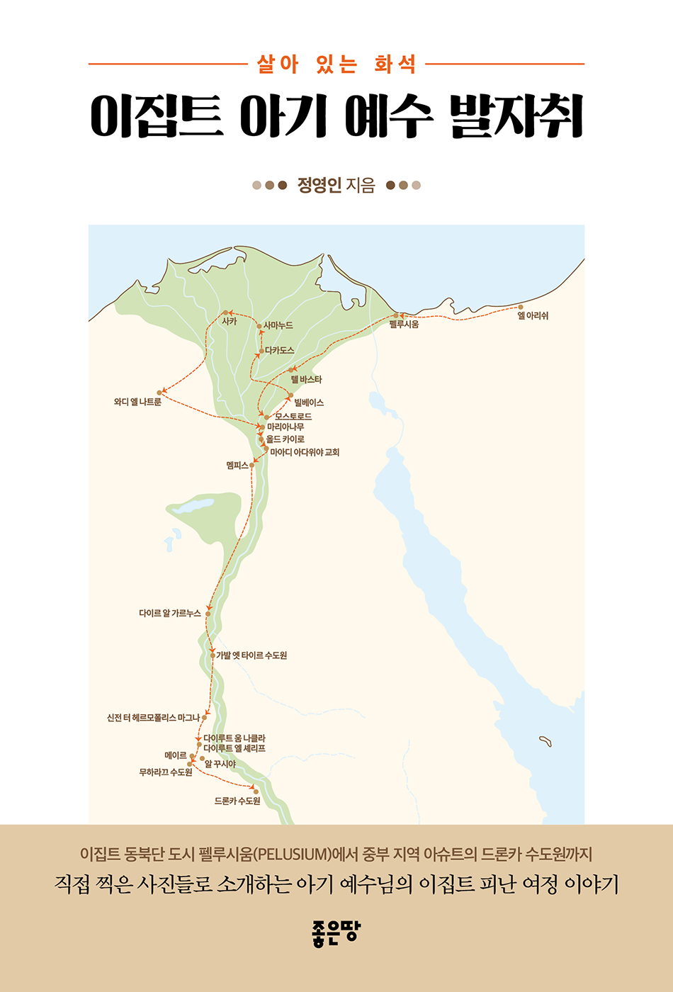 『이집트 아기 예수 발자취』는 성경 마태복음에 단 한 구절로만 언급된 ‘아기 예수의 이집트 피난’ 이야기를, 이집트 기독교(콥트 교회)의 전승과 현지 답사를 통해 체계적으로 정리한 기록이다. 저자는 시나이 반도를 거쳐 이집트 동북단 펠루시움에서 시작해 중부 아슈트의 드론카 수도원에 이르기까지, 성가족이 이동했다고 전해지는 약 2,000km의 여정을 직접 답사하며 각 지역의 교회·수도원·유적을 사진과 함께 소개한다. 또한 이 책은 이집트 기독교가 1세기부터 이어져 온 보편적 기독교 전통임을 설명하며 성경 정경과 위경, 역사 기록, 콥트 교회의 전승을 함께 검토하며 아기 예수 피난 여정의 역사적·신앙적 의미를 균형 있게 살핀다.