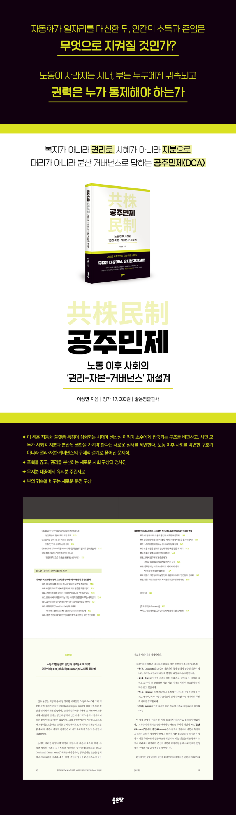 이 책은 “더 나눠 주자”가 아니라 “아예 처음부터 권리자로 살게 하자”는 제안이다. 노동 중심 사회계약 이후의 질서를, 권리–자본–거버넌스라는 한 덩어리의 설계 문제로 다시 짜는 것. 공주민제는 그 재설계를 통해, 전환기에도 시장은 소비자를 유지하고 민주정은 시민을 유지할 수 있는 조건을 제시한다.