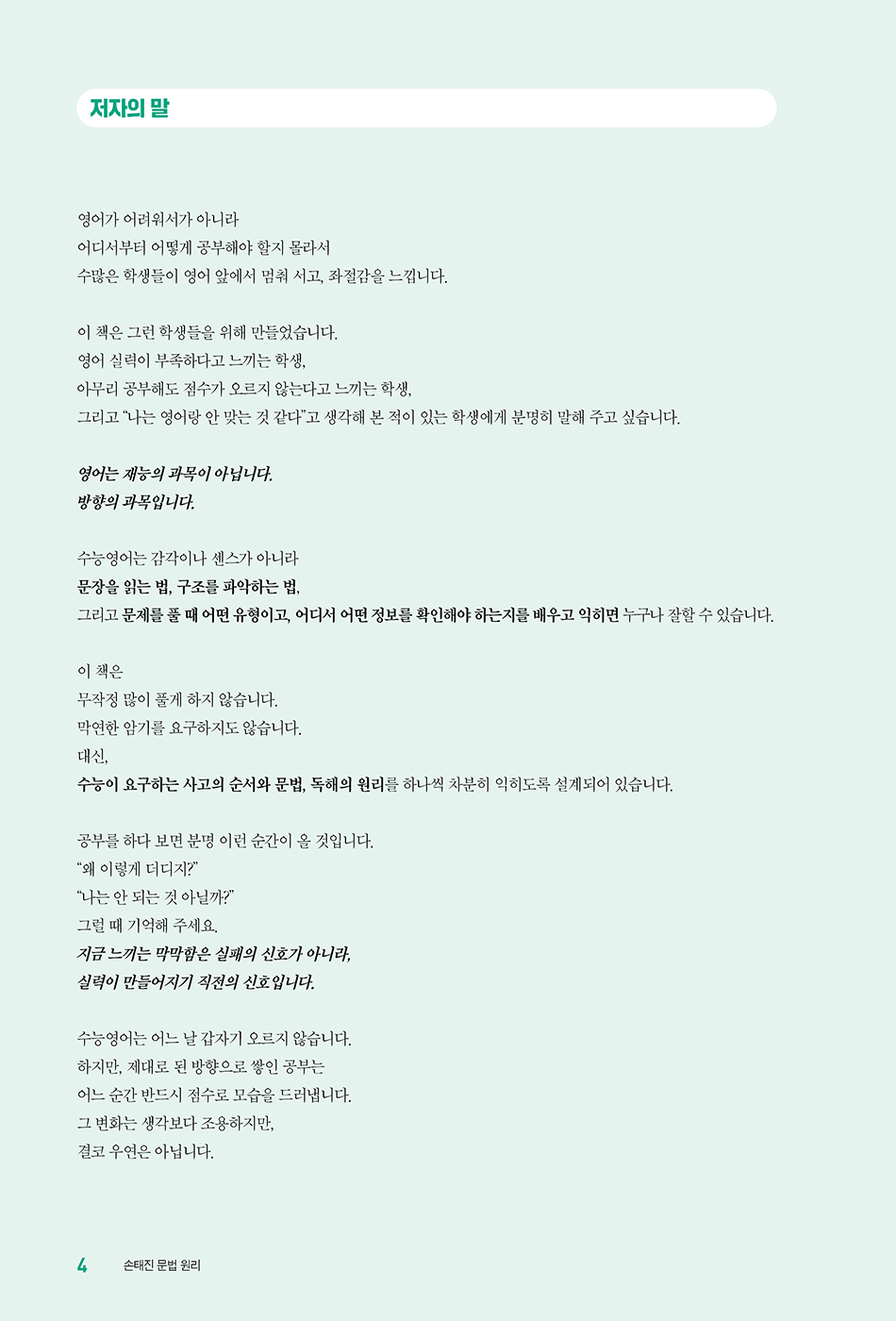 인물 상세 정보저는 서강대 대학원을 졸업했고, 학교 다닐 때에는 영어에 미쳐서 살았습니다. 영어를 너무 잘하고 싶어, 몇 개월간 한국말을 한 번도 하지 않은 적도 있습니다. 대학생활의 거의 대부분을 TIME와 CNN 그리고 영어 Debating을 하면서 재미있게 보냈습니다. 대학교 2학년 때 토익과 토플이 만점이 나왔으며, 25년간을 시험 영어만 연구하고, 강의하고 있습니다. 많은 책과 모의고사를 집필해서 누구보다 정확한 출제자의 시선을 가지고 있습니다. 지문의 어디에서 빈칸이 있고, 어디에서 어떤 문제를 출제할지를 정확히 볼 수 있습니다. 현재는 공단기(ST Unitas)에서 영어과 대표교수로 강의하고 있습니다. 3년 전 딸이 중3이던 때부터 영어를 직접 가르치면서, 중, 고등부 학원에 관심을 가지게 되었습니다. 한 살이라도 어릴 때부터, 제대로, 체계적으로 강의를 하면, 엄청난 효과를 볼 수 있다는 것을 느꼈고, 전에 없던 보람을 찾게 되었습니다. 그래서, 손태진 영어학원을 개원하게 되었고, 수능 관련 교재를 집필하게 되었습니다.