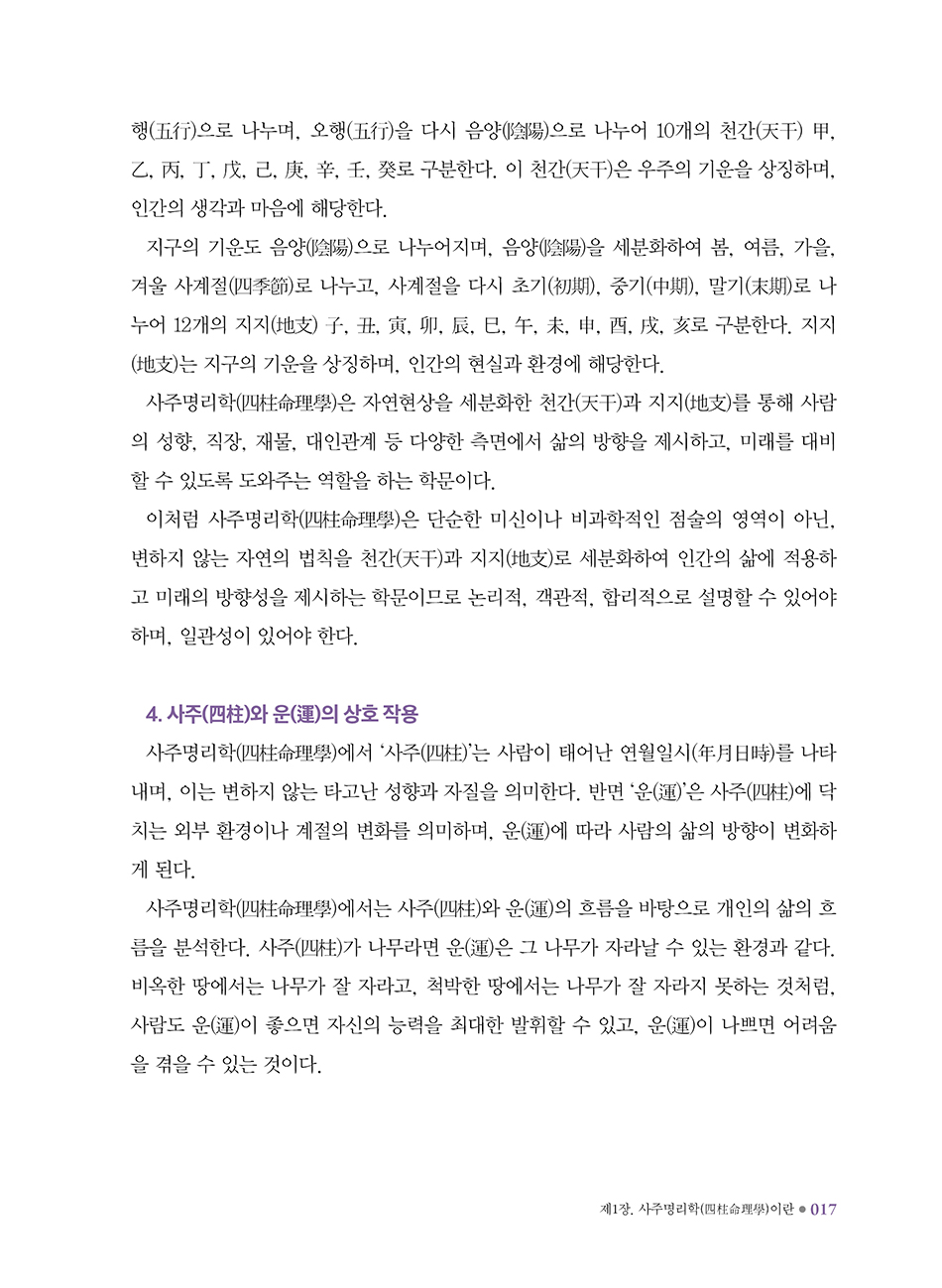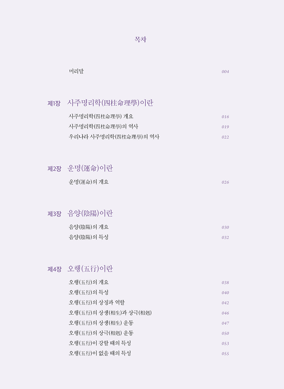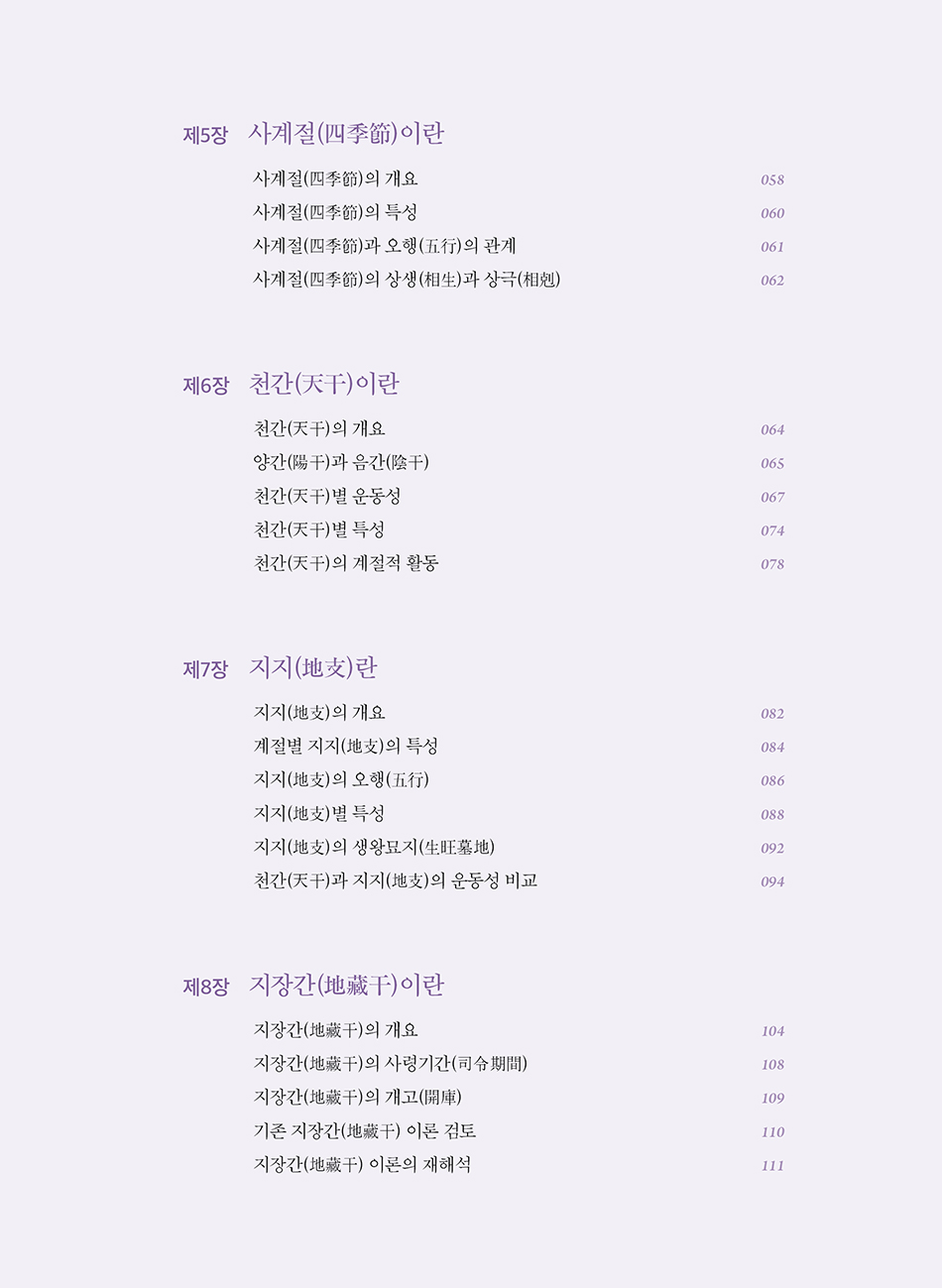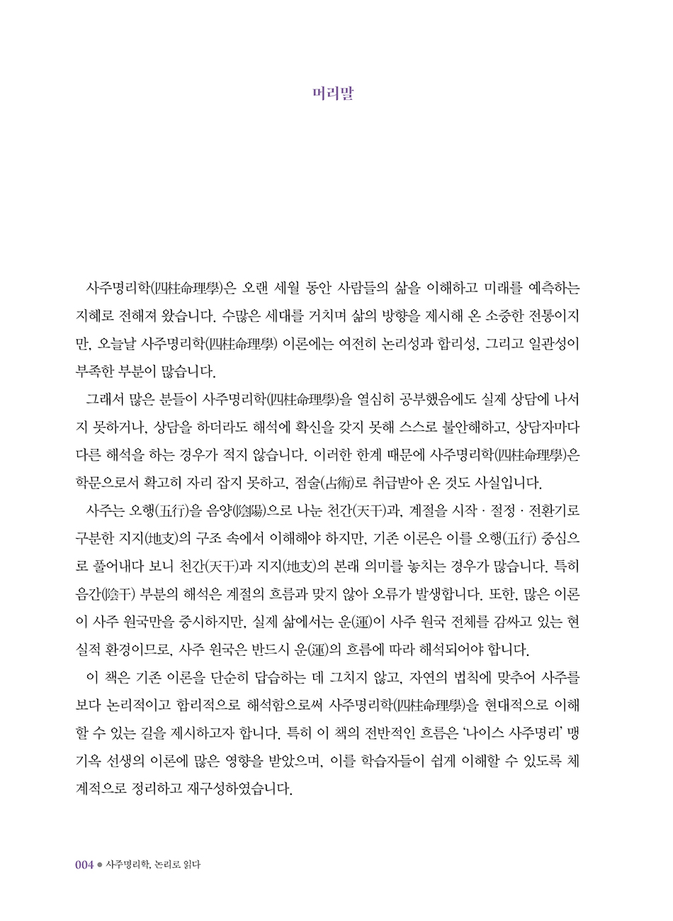 사주를 단순히 운명을 맞히는 도구가 아니라, 자연의 섭리에 따라 삶을 경영하는 합리적인 학문으로 정립하고자 하는 저자의 노력이 돋보인다. 오행 중심의 단편적인 해석에서 벗어나 천간과 지지로 이루어진 사주와 운의 변화를 입체적으로 다룬다. 특히 사주 원국에만 매몰되지 않고, 원국을 감싸고 있는 현실적 환경인 ‘운’의 흐름에 따라 사주를 해석해야 한다는 점을 강조한다.