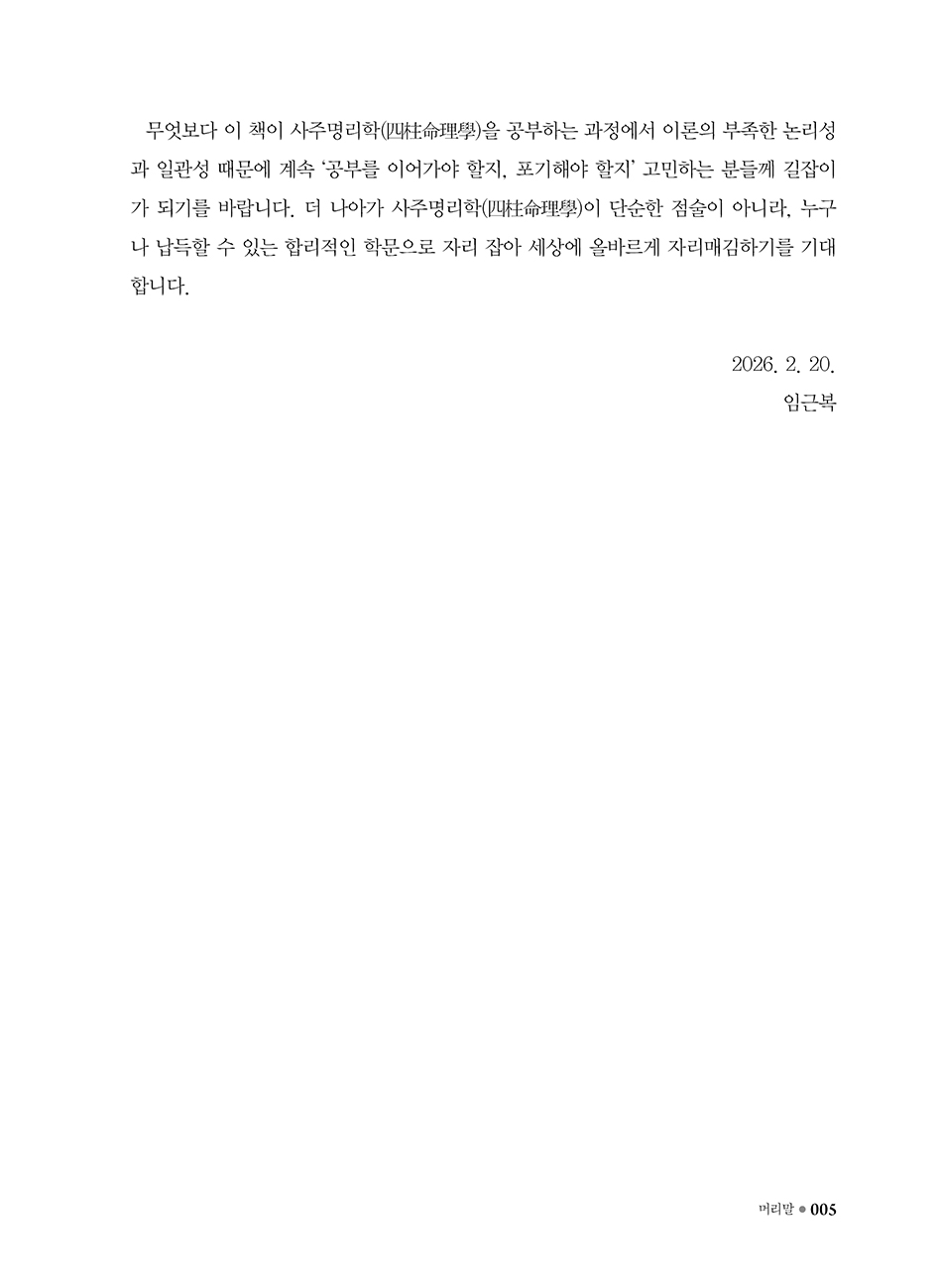 이 책은 사주 공부를 처음 시작하는 입문자부터 상담 현장에서 기준의 모호함으로 인해 해석의 확신을 갖지 못하고 방황하는 전공자까지 모두를 아우르는 완벽한 길잡이다. 복잡한 이론을 학습자가 이해하기 쉽게 논리적으로 재구성하여, 이론의 불명확한 기준 때문에 공부를 포기하려던 이들에게 명쾌한 해답을 제공한다. 독자는 이 책을 통해 자신의 삶을 객관적으로 응시하고, 미래의 방향성을 스스로 설정할 수 있는 지적 근력을 기르게 될 것이다.