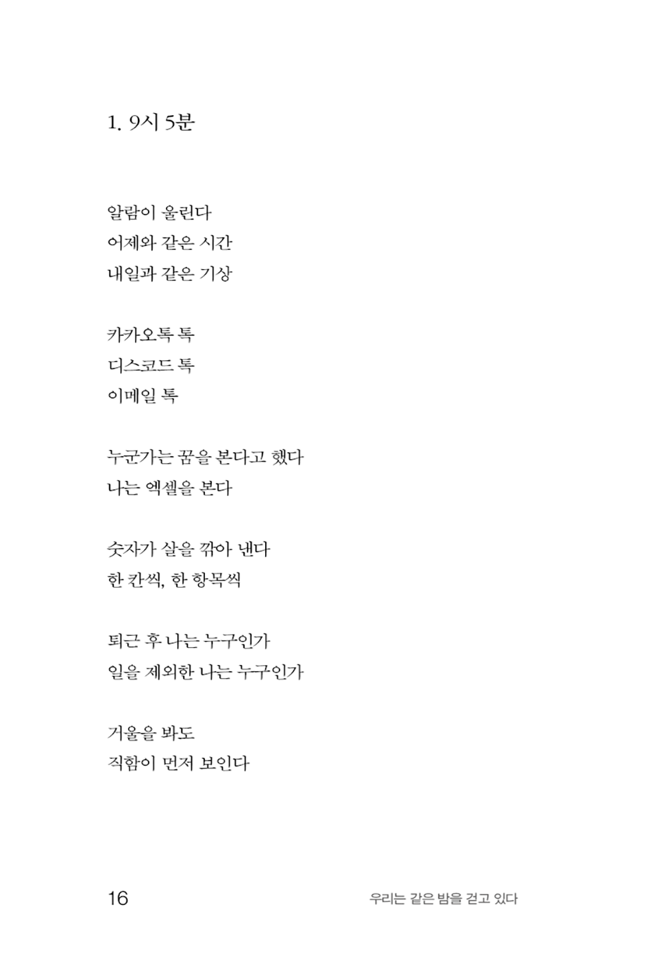 이 첫 번째 시집 『우리는 같은 밤을 걷고 있다』는 우리 시대의 가장 솔직한 외침이자, 혼자라고 느끼는 모두에게 건네는 위로의 말이다