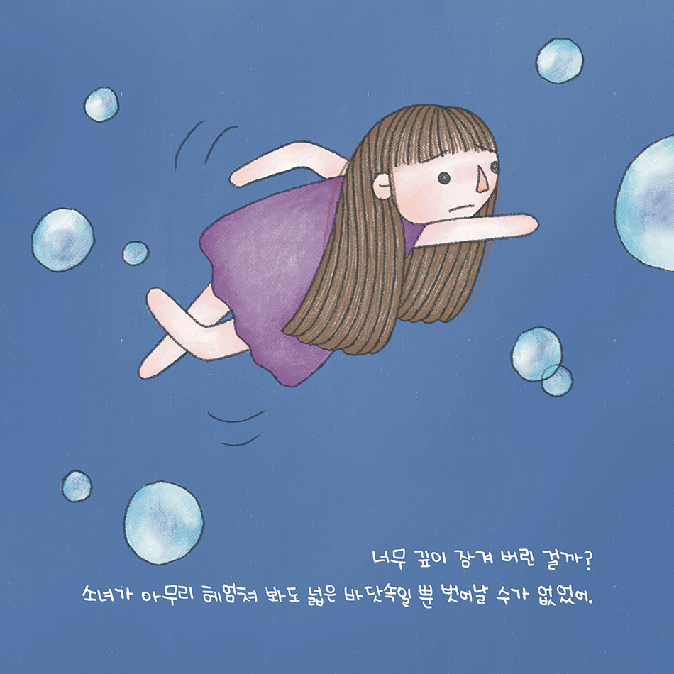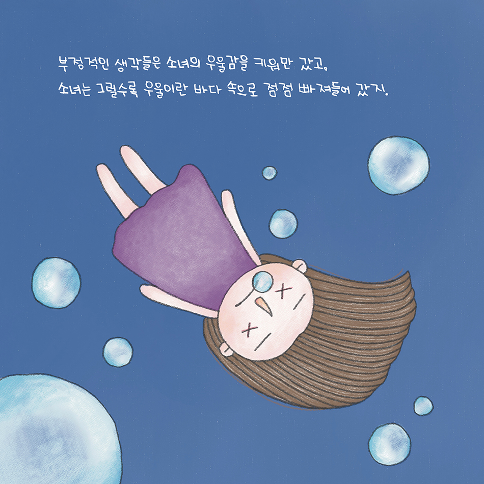 이야기의 주인공인 소녀는 어느 순간부터 쉽게 상처받고 자꾸만 우울해진다. “되는 일이 하나도 없어.” “어차피 결과는 좋지 않을 거야.” 같은 생각들이 머릿속을 떠나지 않는다. 부정적인 생각들은 점점 커져 소녀를 깊은 우울의 바다 속으로 끌어당긴다. 소녀는 그 바다에서 빠져나오려 애쓰지만 어디까지 헤엄쳐도 끝이 보이지 않는다. 결국 지쳐 버린 소녀는 모든 것을 내려놓고 그곳에 가라앉고 만다.