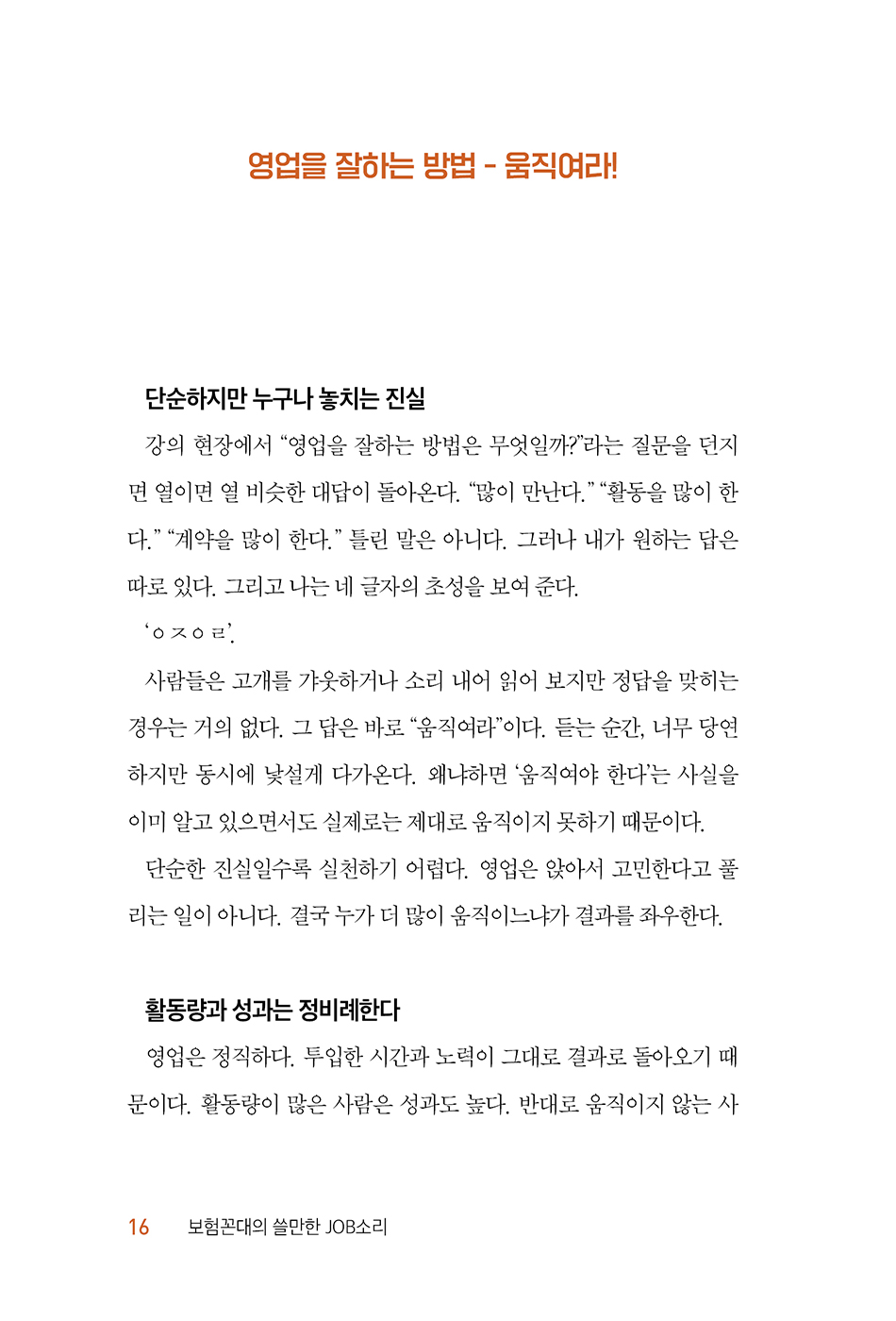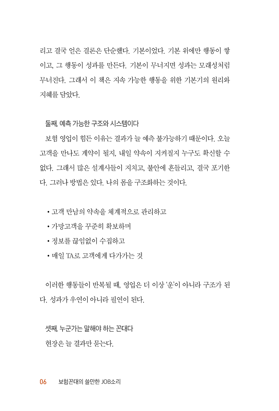 《보험꼰대의 쓸만한 JOB소리》는 28년 보험 영업 현장에서 축적된 경험을 바탕으로, ‘성과를 만드는 영업의 본질’을 행동 중심으로 풀어낸 실전 가이드다. 이 책은 화려한 이론이나 기술보다, 실제 현장에서 바로 적용 가능한 단순하고 명확한 원칙을 제시한다. 책은 WHY(왜 하는가), WHAT(무엇을 하는가), HOW(어떻게 하는가), HABIT(어떻게 지속하는가)라는 구조로 구성되어 있다. ‘왜’라는 질문에서 출발해, 영업의 본질과 정체성을 이해하고, 이를 실행 가능한 행동과 습관으로 연결한다. 특히 “성과는 결심이 아니라 구조에서 나온다”는 메시지를 중심으로, 예측 가능한 영업 시스템을 만드는 방법을 구체적으로 제시한다.