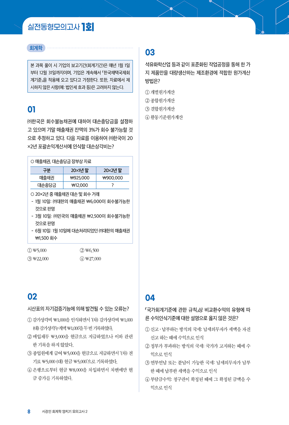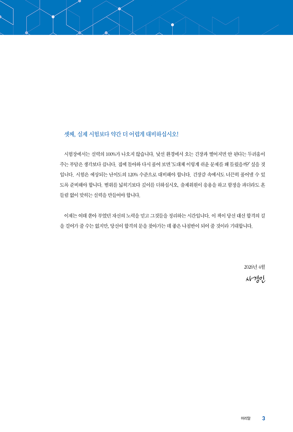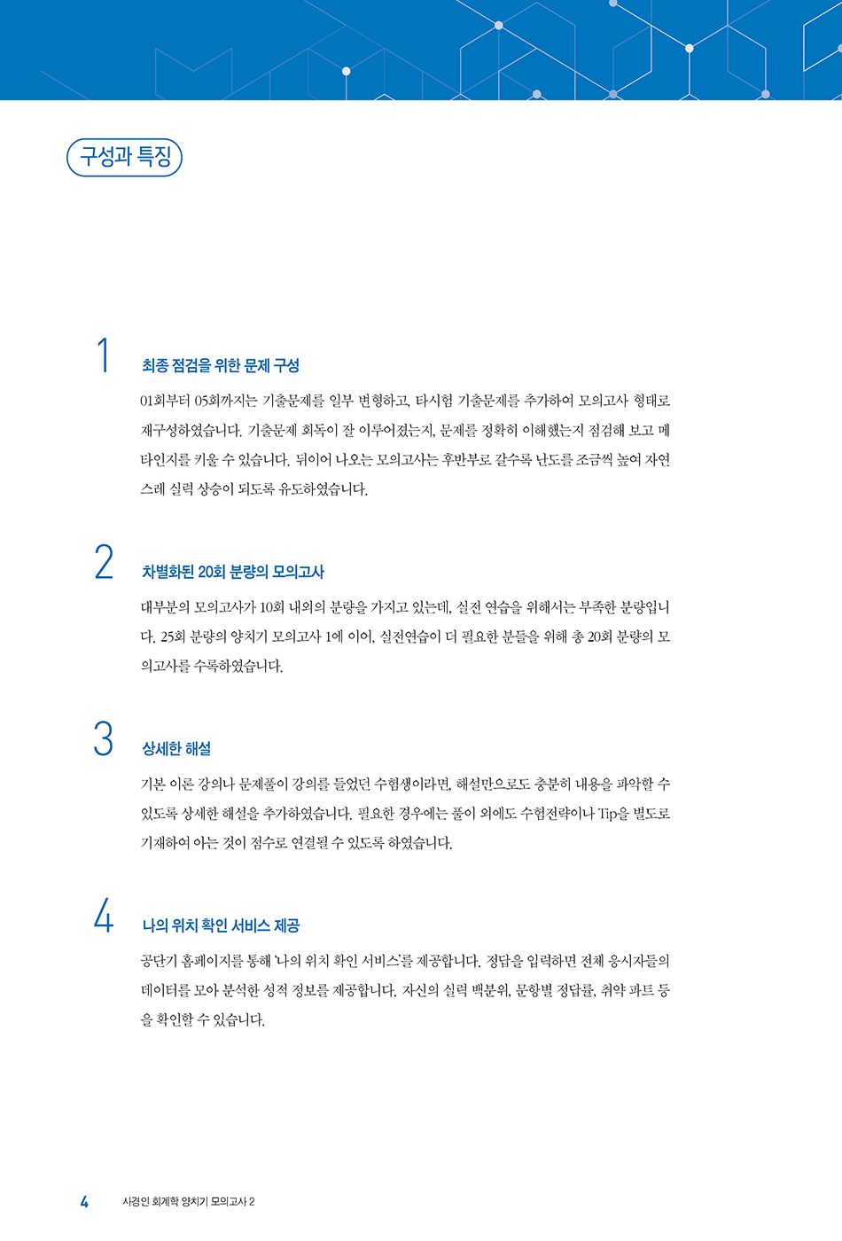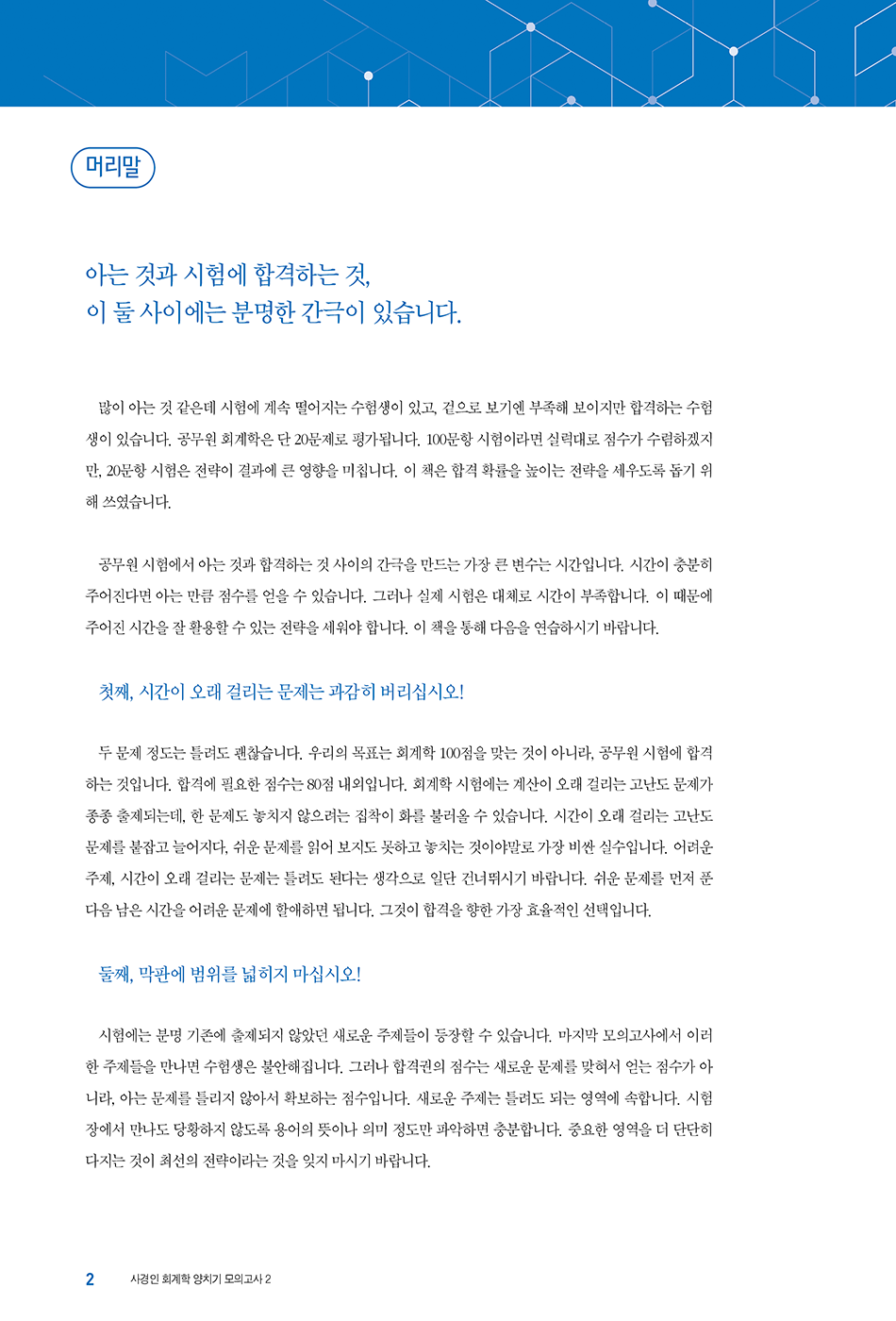 『사경인 회계학 양치기 모의고사 2』는 공무원 회계학 합격을 위한 최적의 실전 전략서이다. 본서는 수험생들이 실전에서 겪는 시간 부족 문제를 해결하기 위해 고안되었으며, 20회분의 풍부한 모의고사를 통해 완벽한 시간 안배 훈련을 지원한다. 기출 변형부터 고난도 응용 문제까지 단계별로 구성되어 실력을 체계적으로 끌어올릴 수 있으며, 강의가 필요 없을 만큼 상세한 해설과 전략 팁을 수록했다. 또한 온라인 성적 분석 서비스를 통해 자신의 객관적인 위치를 파악할 수 있다.