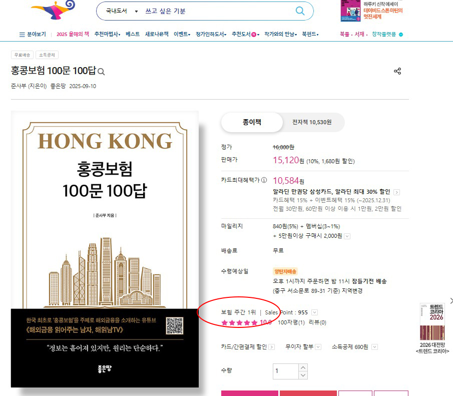 ‘홍콩보험 100문 100답’이 알라딘에서 1위를 기록했습니다.