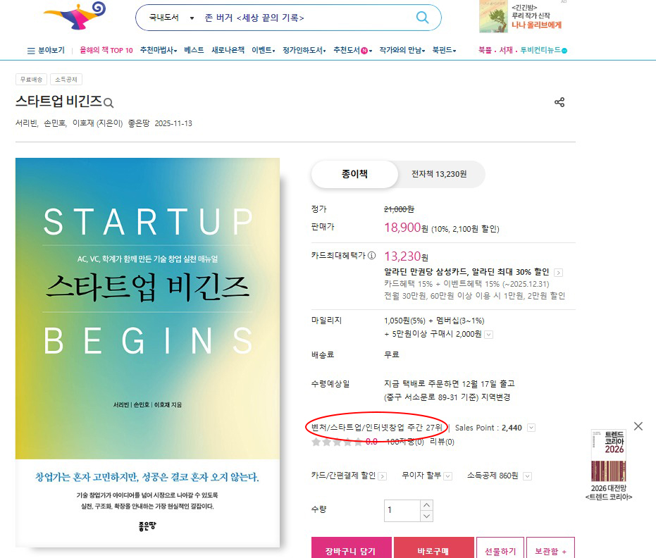 ‘스타트업 비긴즈’가 알라딘에서 27위를 기록했습니다.