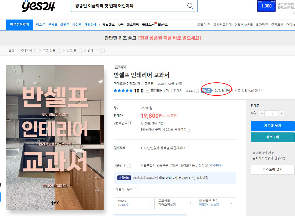 ‘반셀프 인테리어 교과서’가 YES24에서 3위를 기록했습니다.