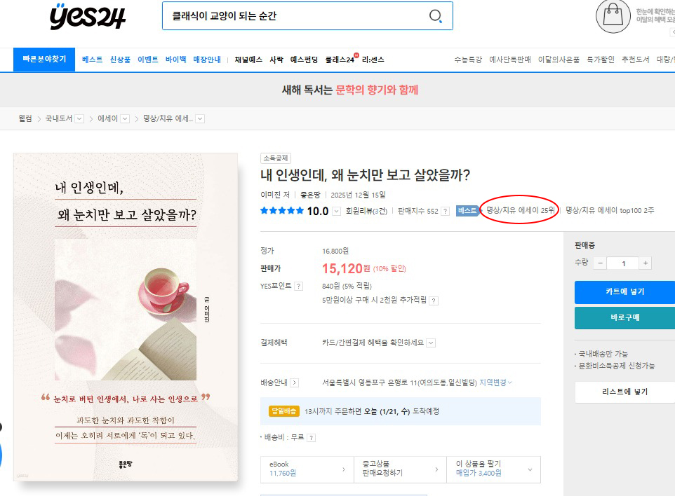 ‘내 인생인데, 왜 눈치만 보고 살았을까?’가 YE24에서 명상/치유 에세이 25위를 기록했습니다.