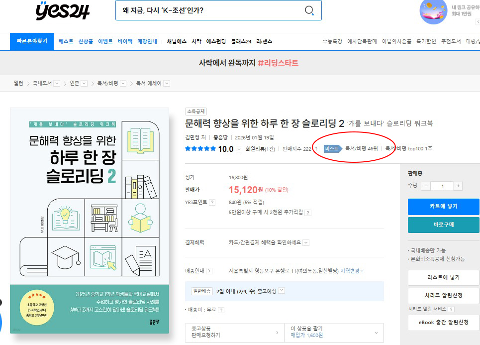 ‘문해력 향상을 위한 하루 한 장 슬로리딩 2’가 YES24에서 독서/비평 46위를 기록했습니다.