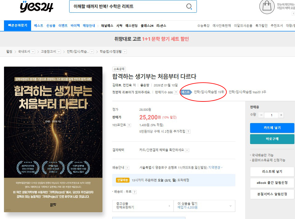 ‘합격하는 생기부는 처음부터 다르다’가 YES24에서 진학/입시/학습법 15위를 기록했습니다.
