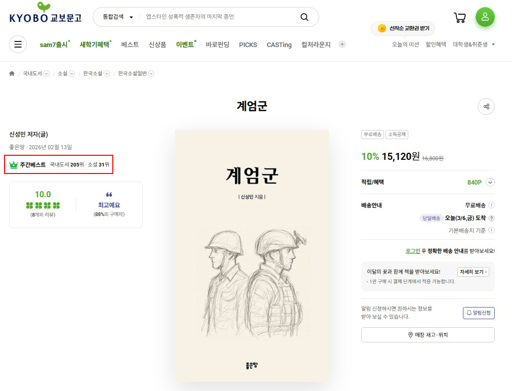 ‘계엄군’이 교보문고에서 소설 31위를 기록했습니다.