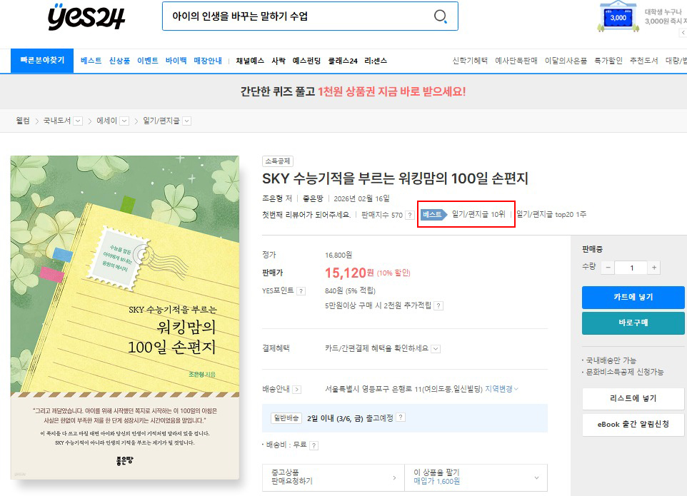 ‘SKY 수능기적을 부르는 워킹맘의 100일 손편지’가 YES24에서 일기/편지글 10위를 기록했습니다.