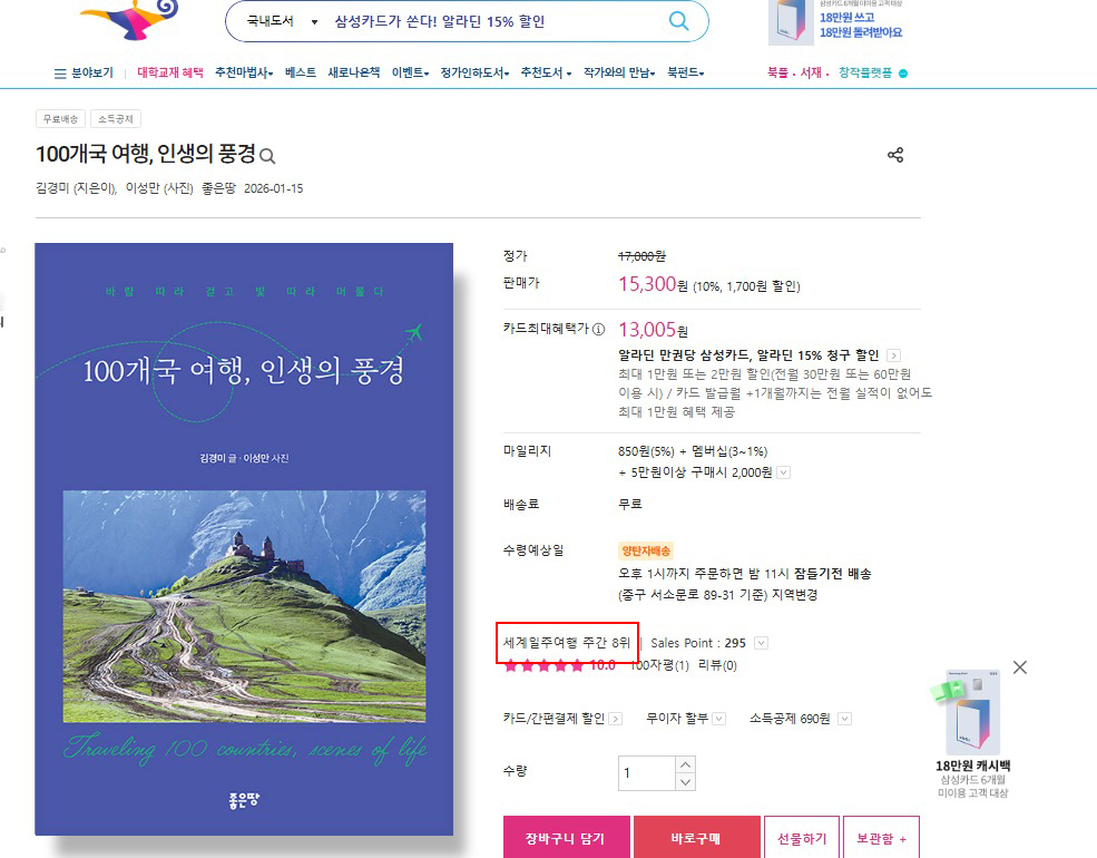 ‘100개국 여행, 인생의 풍경’이 알라딘에서 8위를 기록했습니다.
