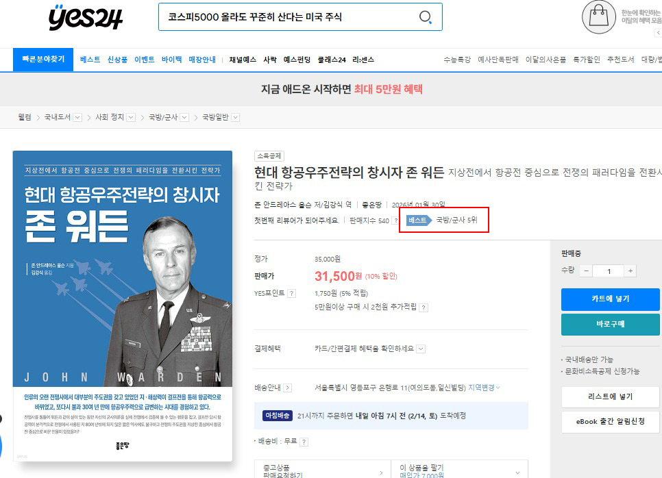 ‘현대 항공우주전략의 창시자 존 워든’이 YES24에서 국방/군사 5위를 기록했습니다.