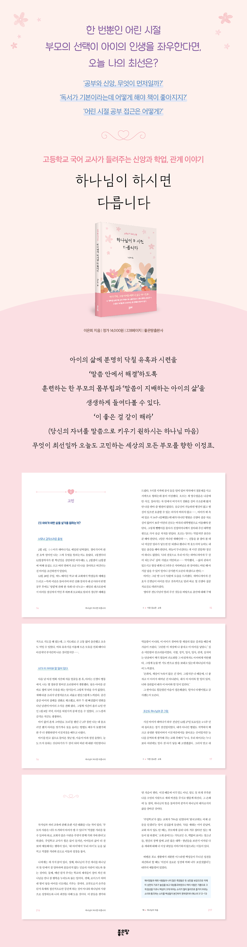 다른 세대를 살아가고 있음이 확실하다. 공감의 포인트가, 감성이, 관심사가, 할애하는 시간과 대상이, 목표가 너무나 다르다. 시대를 보는 눈도 다를 것이다. 어쩌면 아이들과 어른뿐 아니라 어른들 서로 간에도……. 하지만 진리는, 하나님의 마음과 목적은 동일하다. 주의 자녀인 우리가 하나님을 기뻐하고 하나님께 영광 돌리는 삶을 사는 것! 그 확실하고 변함없는 ‘존재 이유’ 앞에서 흔들리지 말고 가면 된다. 세상이 나를 흔들어대도 ‘절대 가치인 하나님 손’만 잡고 걸으면 안전하고 확실하다.