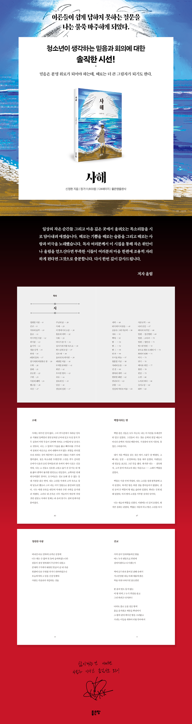 일상의 작은 순간들 그리고 마음 깊은 곳에서 울려오는 목소리들을 시로 담아내려 애썼습니다. 때로는 기쁨을 때로는 슬픔을 그리고 때로는 사랑과 비극을 노래했습니다. 독자 여러분께서 이 시집을 통해 작은 위안이나 울림을 얻으신다면 부족한 시들이 여러분의 마음 한편에 조용히 자리하게 된다면 그것으로 충분합니다.