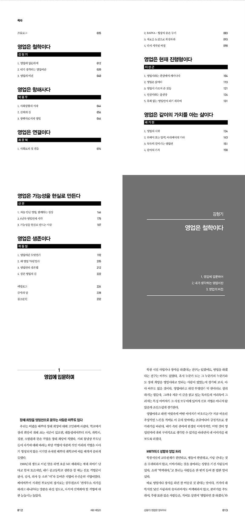영업의 치열한 현장에서 부딪히고 깨지며 얻은 생생한 통찰을 담고자 했다. 서로 다른 자리에서 같은 고민을 안고 살아온 7명이 모여, 영업이란 무엇인지, 어떻게 살아갈 것인지 묻고 답한다. 영업을 시작하는 이들에게는 길잡이가 되고, 오래 걸어온 이들에게는 자신을 돌아보는 거울이 되기를 희망한다.