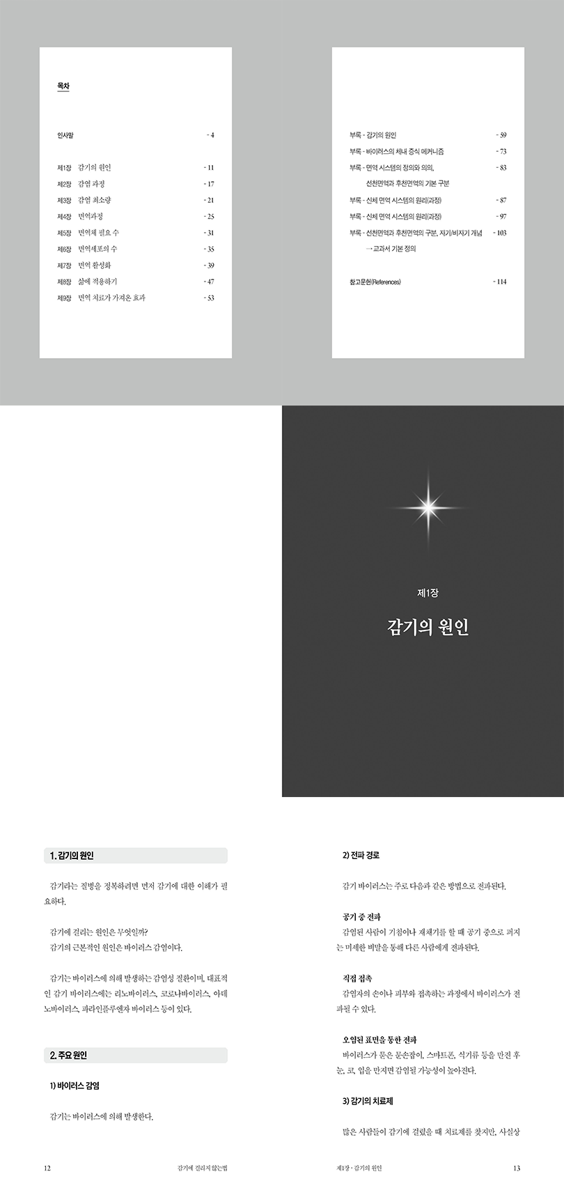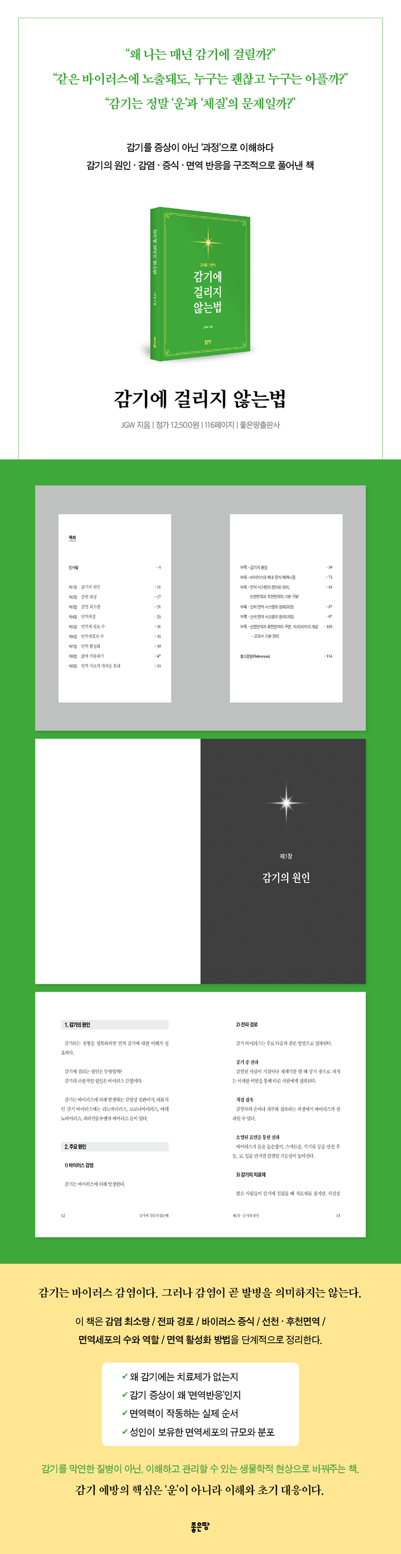 이 물음은 면역 체계와 감염 메커니즘에 대한 깊이 있는 연구로 이어졌으며, 그 과정에서 면역력을 최적화하면 감기를 예방하고 신체가 보다, 안정적으로 기능할 수 있다는 사실을 확인했습니다. 이 책은 지난 8년간의 연구와 임상적 체험, 그리고 과학적 근거를 바탕으로 집필되었습니다. 여기에는 단순한 지식 전달을 넘어, 누구나 실천할 수 있는 면역 원리와 감기 예방 전략이 담겨 있습니다. 올바른 인식과 접근, 그리고 훈련을 통해 우리는 언제든지 스스로의 건강을 지킬 수 있습니다. 이 책을 통해 감기 예방을 넘어 면역 체계를 근본적으로 이해하고, 강화하여 건강한 삶을 지속하는 데 도움이 되기를 바랍니다.