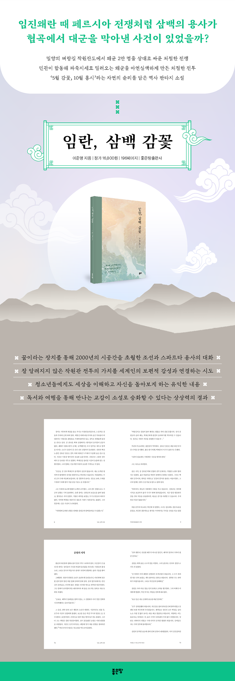 아리스토데모스는 (중략) 1592년, 동방의 나라 조선에서 거대한 전쟁의 불길이 타오르는 것을 내다보았다. 왜의 대군이 바다를 건너오리라. 그리고 그의 영혼은 경상도 땅의 한 좁은 협곡, 작원관에 주목했다. 강 절벽에 난 길. 험준한 산을 가로지르는 좁고 긴 벼랑길. 그곳을 장악하려는 거대한 침략군과 소수의 병력으로 필사적인 방어전을 펼치는 군대.