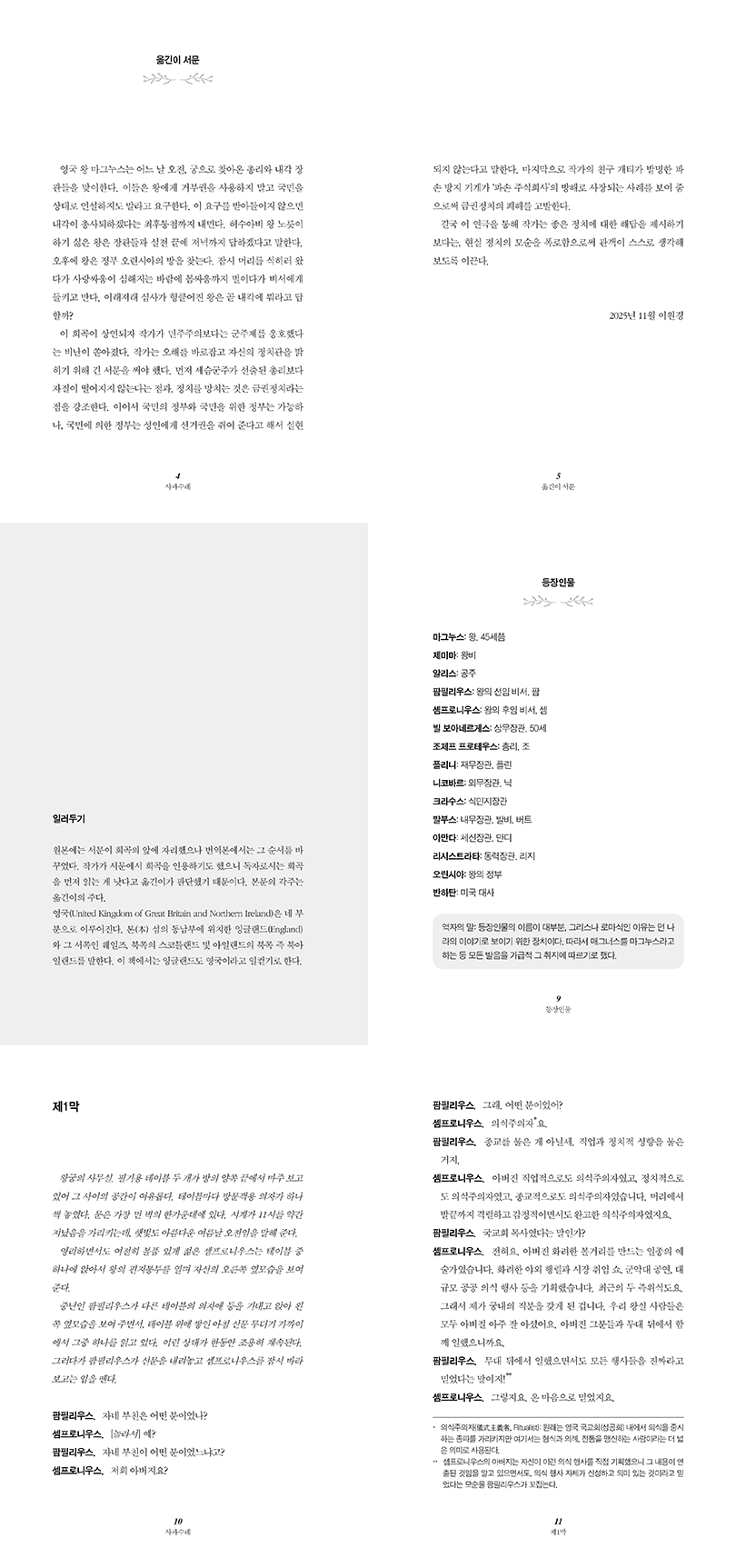 그런데 왕이란 게 뭡니까? 부자들이 왕을 우상으로 세워 놓고는 희생양이자 꼭두각시로 삼아 나라를 통치하는 것이지요. 하지만 대통령은 국민이 선택하지요. 국민은 항상 부자들로부터 자신들을 보호해 줄 강력한 지도자를 원하거든요. _마그누스 왕(제1막)