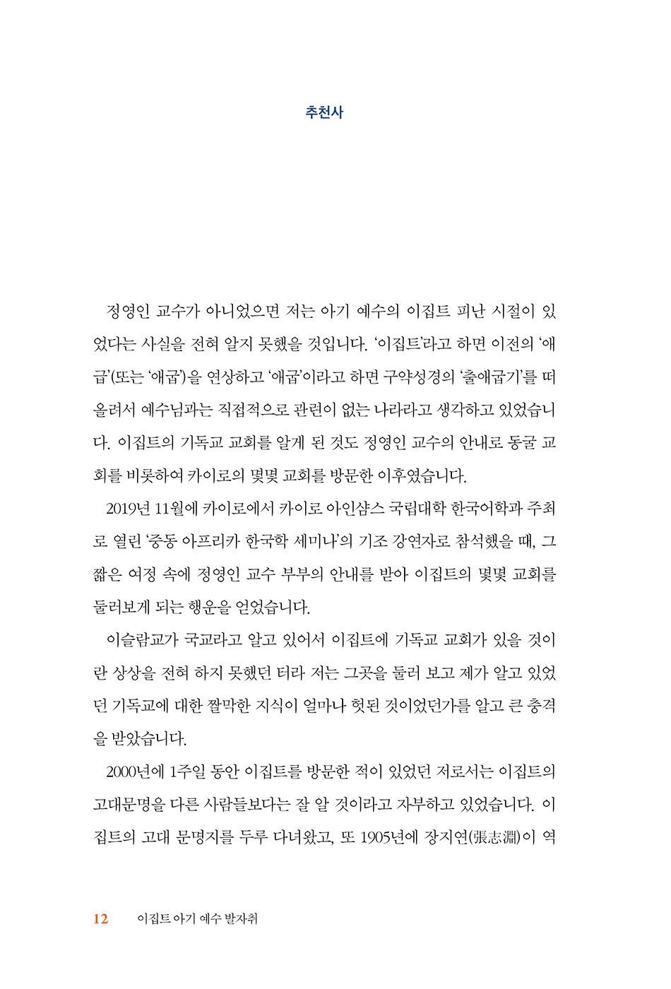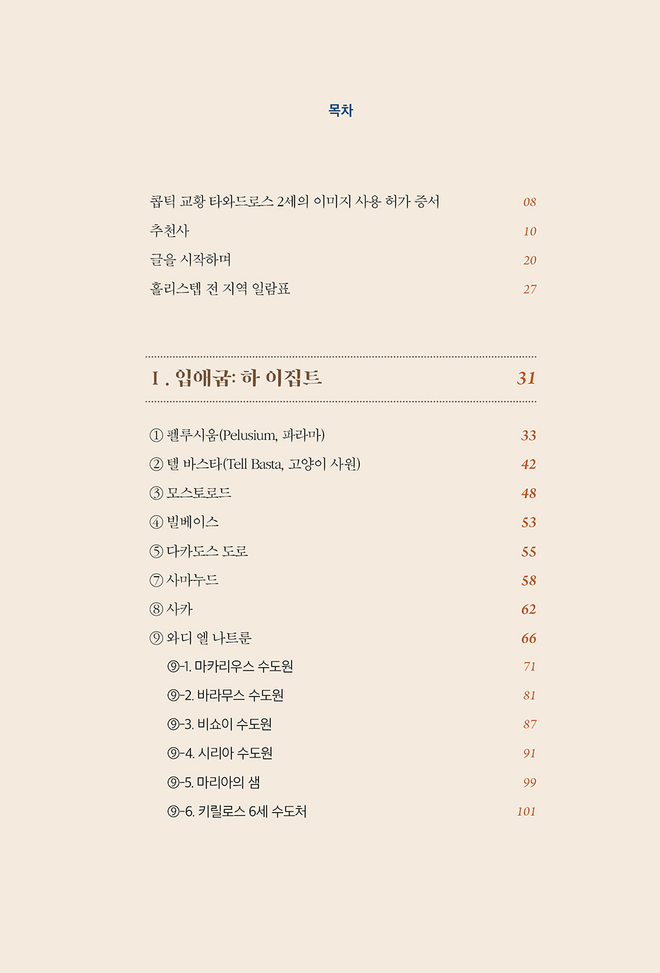 『이집트 아기 예수 발자취』는 성경 마태복음에 단 한 구절로만 언급된 ‘아기 예수의 이집트 피난’ 이야기를, 이집트 기독교(콥트 교회)의 전승과 현지 답사를 통해 체계적으로 정리한 기록이다. 저자는 시나이 반도를 거쳐 이집트 동북단 펠루시움에서 시작해 중부 아슈트의 드론카 수도원에 이르기까지, 성가족이 이동했다고 전해지는 약 2,000km의 여정을 직접 답사하며 각 지역의 교회·수도원·유적을 사진과 함께 소개한다. 또한 이 책은 이집트 기독교가 1세기부터 이어져 온 보편적 기독교 전통임을 설명하며 성경 정경과 위경, 역사 기록, 콥트 교회의 전승을 함께 검토하며 아기 예수 피난 여정의 역사적·신앙적 의미를 균형 있게 살핀다.
