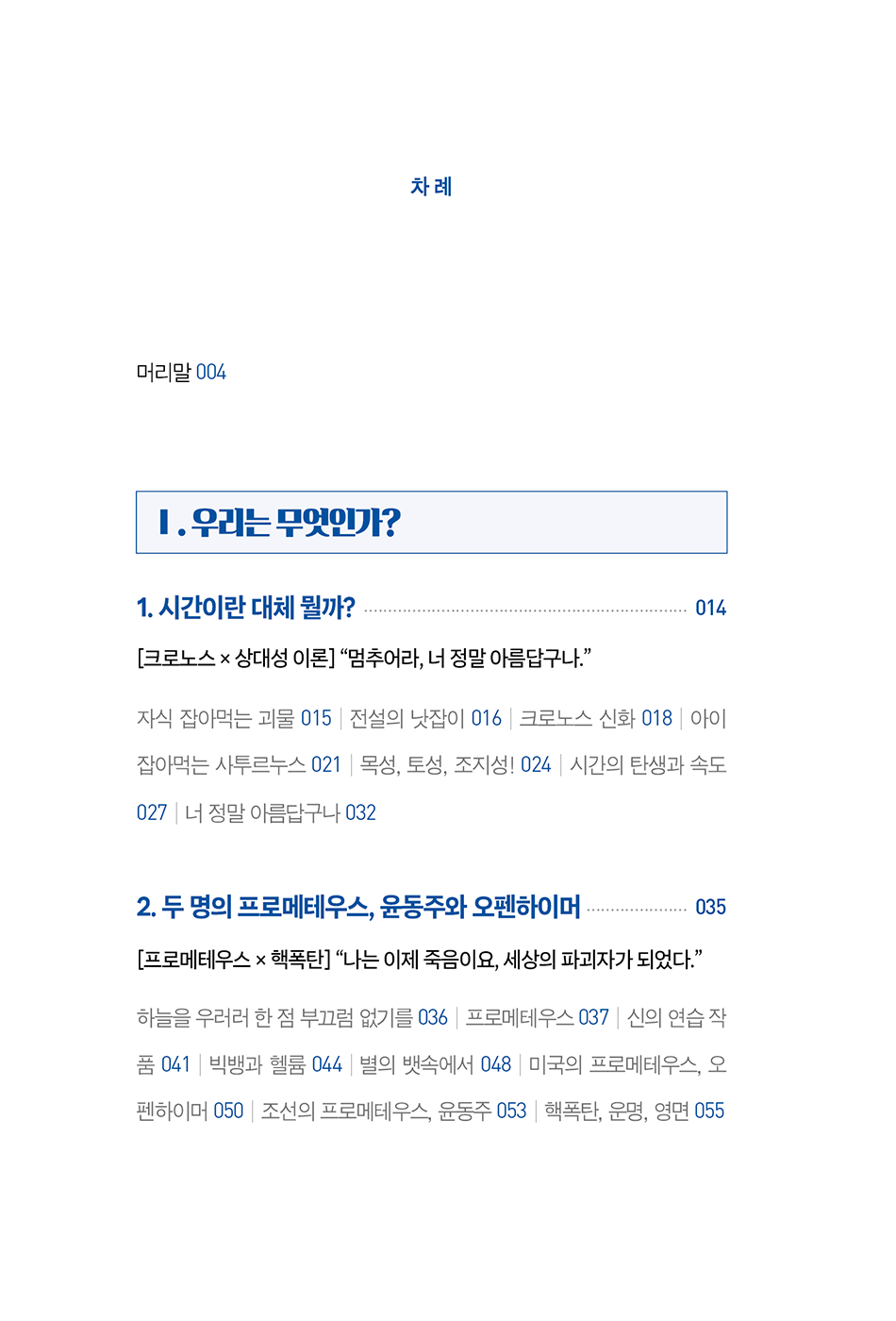 하늘을 우러러 한 점 부끄럼 없기를 │ 프로메테우스 │ 신의 연습 작품 │ 빅뱅과 헬륨 │ 별의 뱃속에서 │ 미국의 프로메테우스, 오펜하이머 │ 조선의 프로메테우스, 윤동주 │ 핵폭탄, 운명, 영면