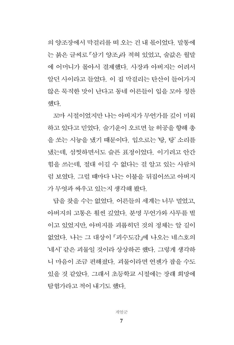 이 소설은 처음부터 끝까지 상상에 의존해 썼다. 미진한 부분은 작가가 과문하고 문재文才가 부족한 탓이다. 특정 사건 및 인물과도 관련이 없다. 창작에 영감을 준 사람은 있으나, 실존 인물과 작중 인물은 아무 관계가 없다는 점을 미리 밝힌다. 주인공의 성장 과정과 독백은 모두 허구이며 창작의 결과에 불과하다. 이 소설은 처음부터 끝까지 문학으로만 봐 주기를 소원한다.