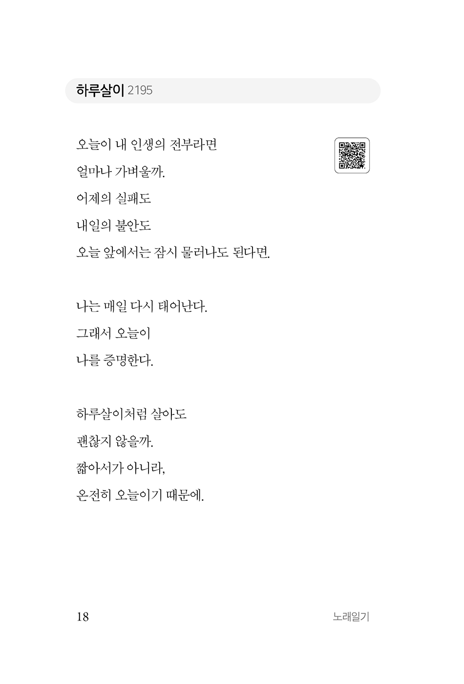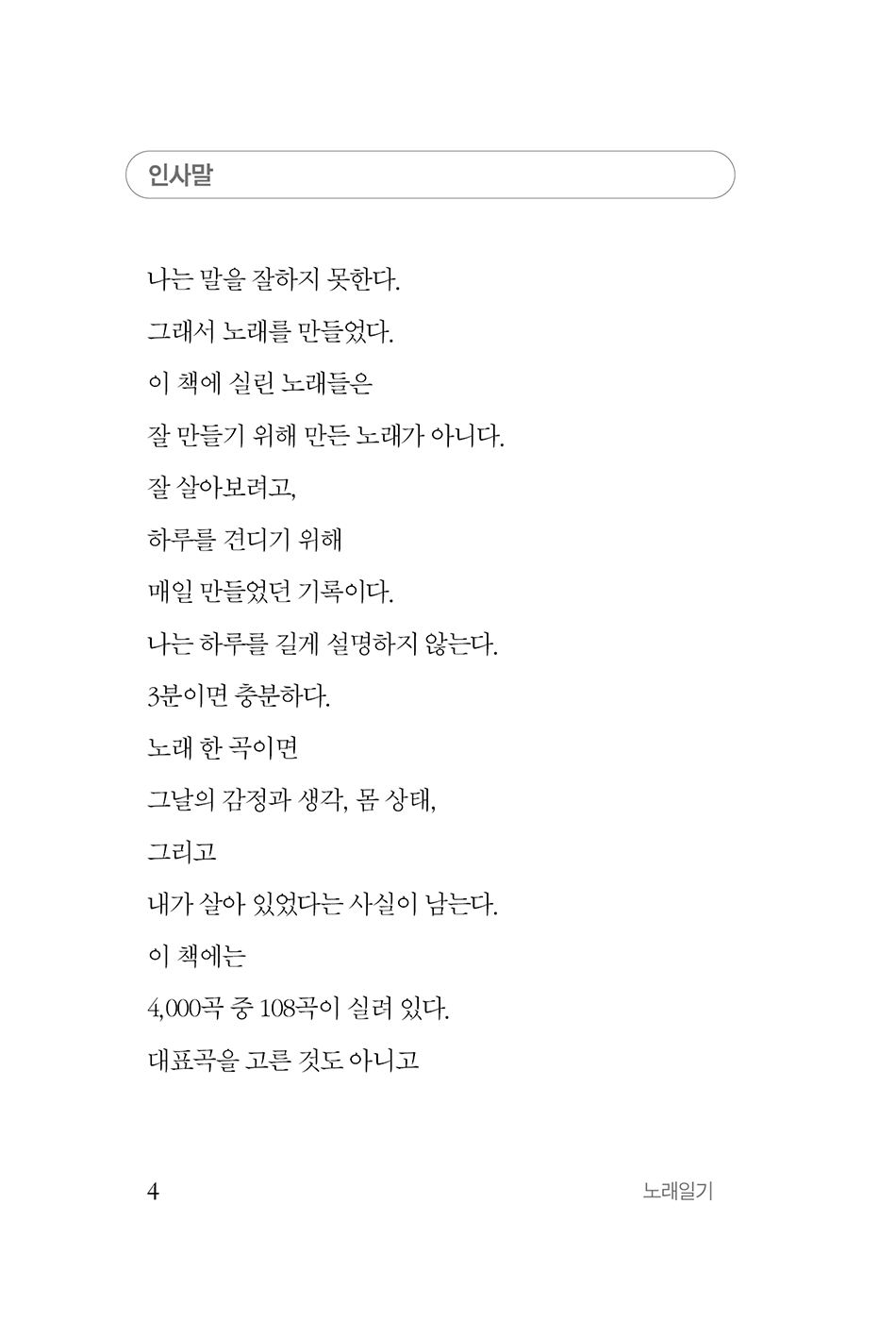 『노래일기』는 매일 한 곡씩 노래를 만들어 온 ‘조용한작곡가’가 4,000곡 중 100여 곡을 골라 엮은 가사집 겸 일기이며, 1996년부터 30년간 작곡을 이어오고 있다. 이는 하루를 견디고 살아낸 기록을 그대로 담은 책으로, 사랑, 가족, 고양이, 새벽, 공부, 산책, 그리고 사소한 일상까지, 노래 한 곡에 담겼던 하루의 감정이 문장으로 펼쳐진다. QR코드를 통해 실제 노래를 들을 수 있어 글과 음악이 함께 완성되는 구성이다.