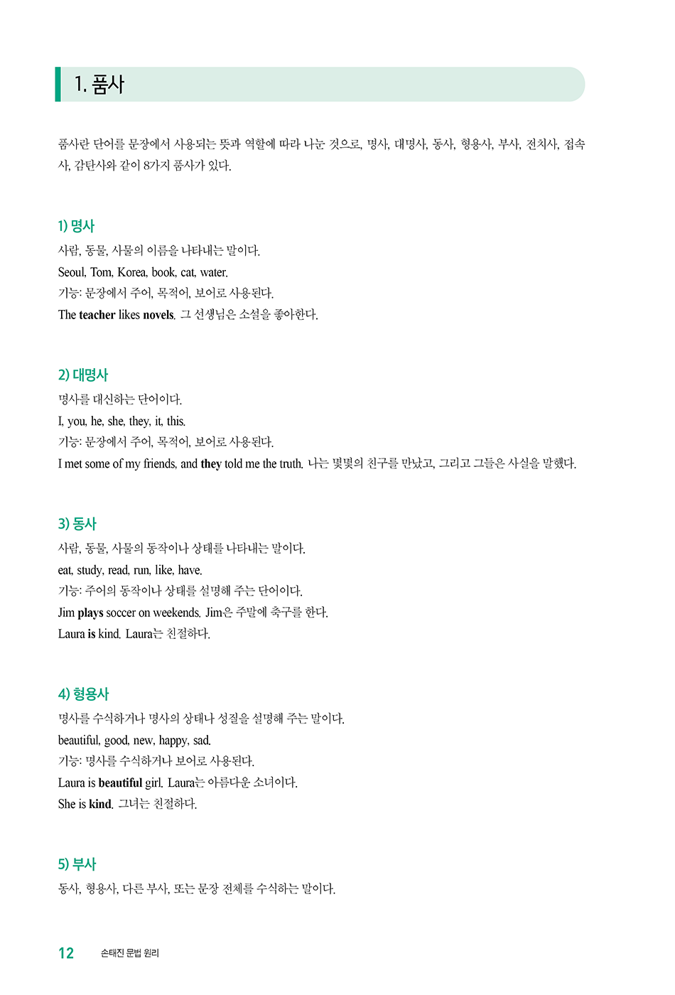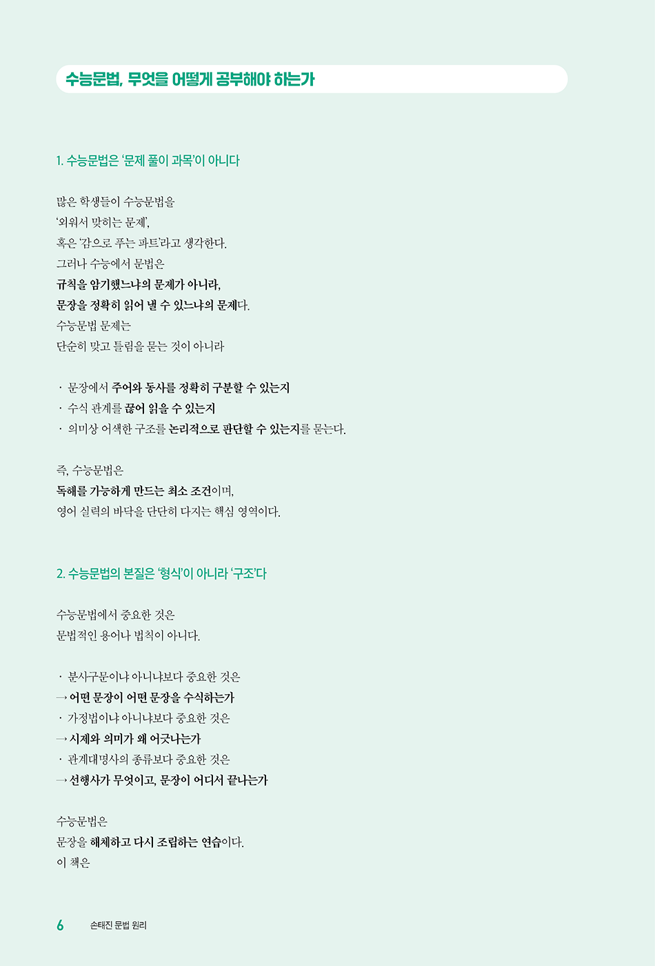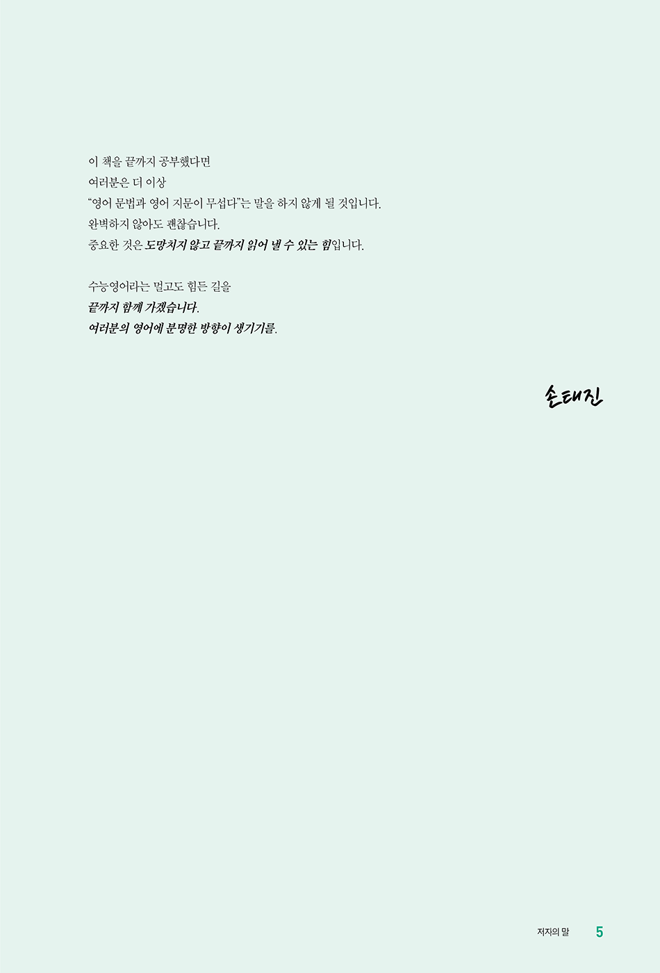 인물 상세 정보저는 서강대 대학원을 졸업했고, 학교 다닐 때에는 영어에 미쳐서 살았습니다. 영어를 너무 잘하고 싶어, 몇 개월간 한국말을 한 번도 하지 않은 적도 있습니다. 대학생활의 거의 대부분을 TIME와 CNN 그리고 영어 Debating을 하면서 재미있게 보냈습니다. 대학교 2학년 때 토익과 토플이 만점이 나왔으며, 25년간을 시험 영어만 연구하고, 강의하고 있습니다. 많은 책과 모의고사를 집필해서 누구보다 정확한 출제자의 시선을 가지고 있습니다. 지문의 어디에서 빈칸이 있고, 어디에서 어떤 문제를 출제할지를 정확히 볼 수 있습니다. 현재는 공단기(ST Unitas)에서 영어과 대표교수로 강의하고 있습니다. 3년 전 딸이 중3이던 때부터 영어를 직접 가르치면서, 중, 고등부 학원에 관심을 가지게 되었습니다. 한 살이라도 어릴 때부터, 제대로, 체계적으로 강의를 하면, 엄청난 효과를 볼 수 있다는 것을 느꼈고, 전에 없던 보람을 찾게 되었습니다. 그래서, 손태진 영어학원을 개원하게 되었고, 수능 관련 교재를 집필하게 되었습니다.