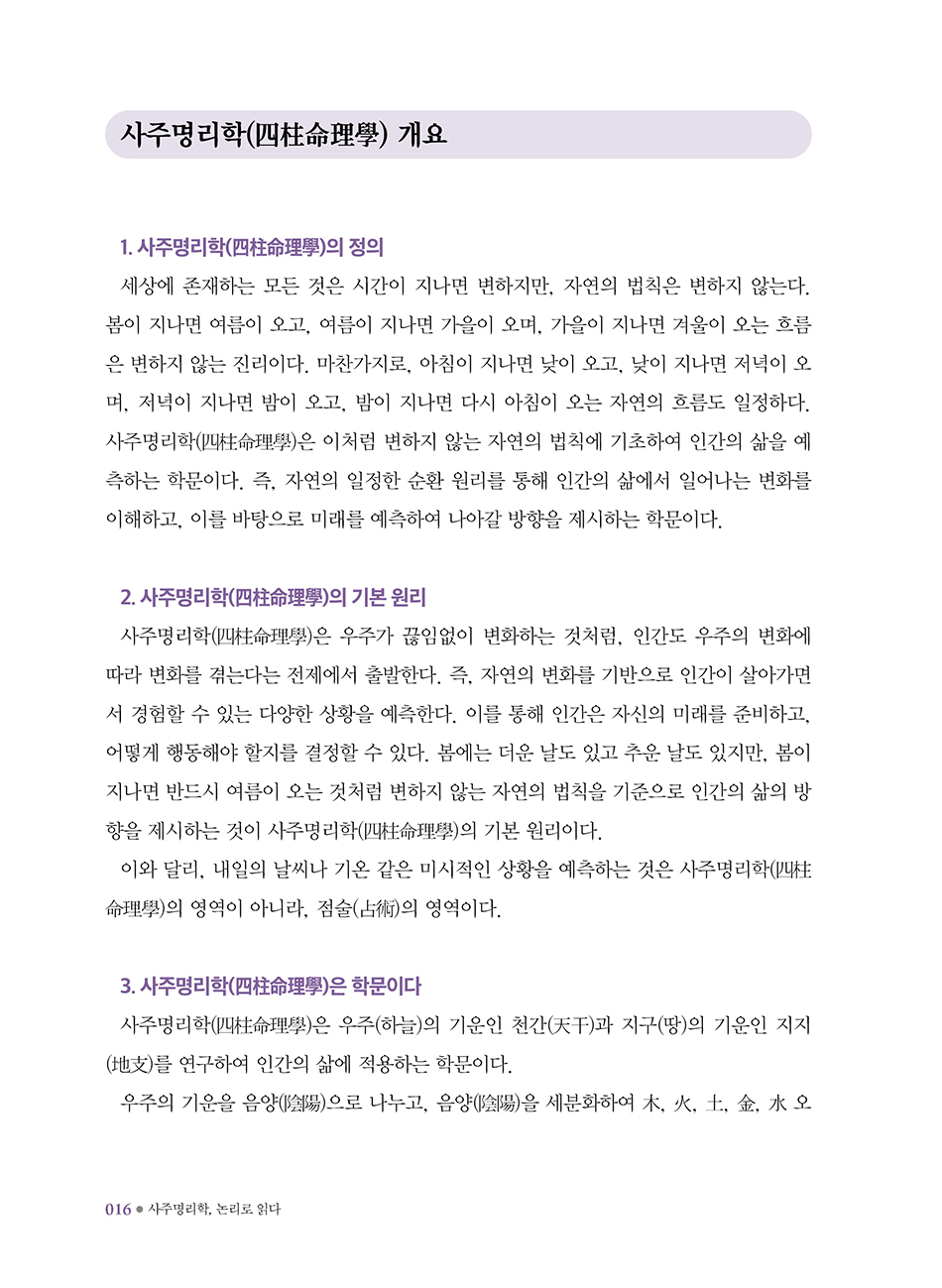 사주를 단순히 운명을 맞히는 도구가 아니라, 자연의 섭리에 따라 삶을 경영하는 합리적인 학문으로 정립하고자 하는 저자의 노력이 돋보인다. 오행 중심의 단편적인 해석에서 벗어나 천간과 지지로 이루어진 사주와 운의 변화를 입체적으로 다룬다. 특히 사주 원국에만 매몰되지 않고, 원국을 감싸고 있는 현실적 환경인 ‘운’의 흐름에 따라 사주를 해석해야 한다는 점을 강조한다.