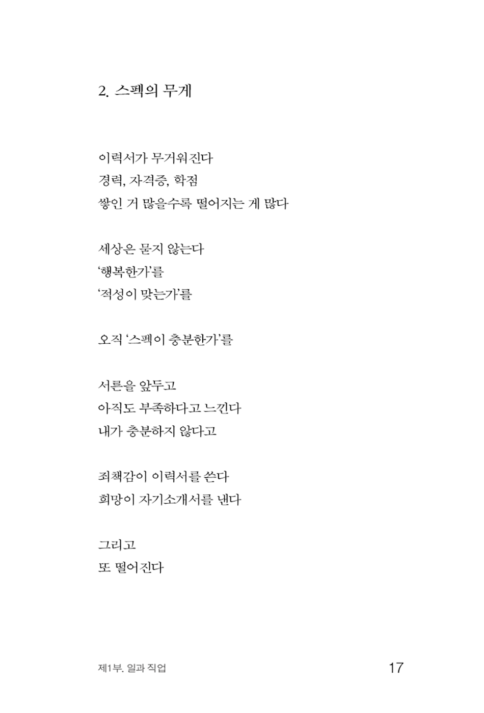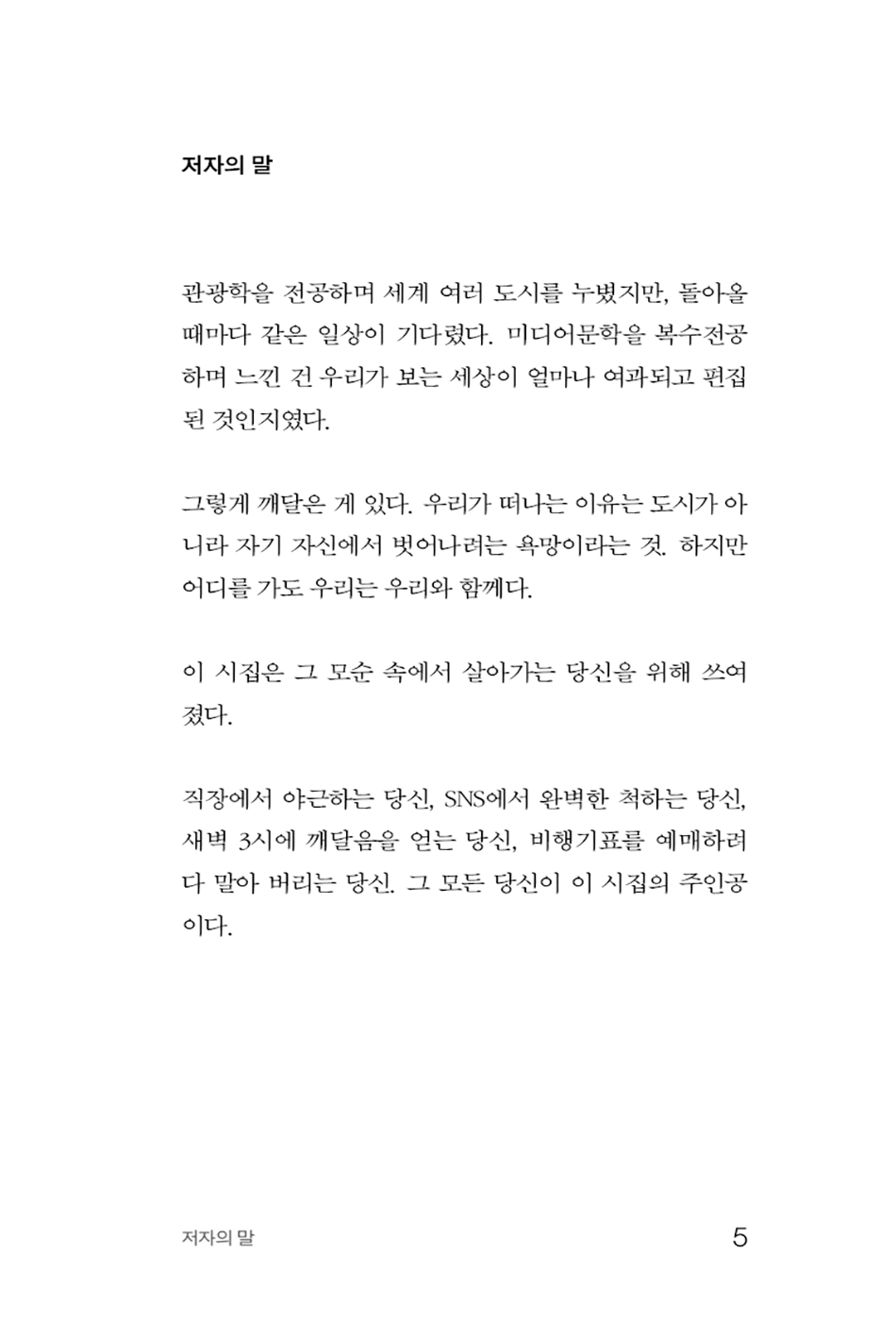 특히 MZ세대가 마주한 취업 불안, 관계의 피상성, 자아 정체성의 혼란, 끊임없는 불안감을 시인의 눈으로 포착하고, 그것을 냉철하면서도 따뜻한 톤으로 표현한다.