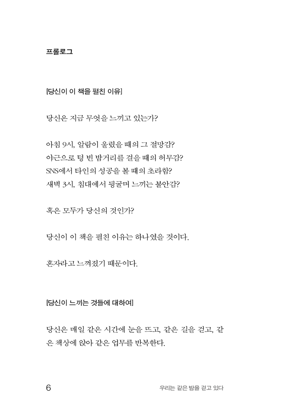 이 첫 번째 시집 『우리는 같은 밤을 걷고 있다』는 우리 시대의 가장 솔직한 외침이자, 혼자라고 느끼는 모두에게 건네는 위로의 말이다