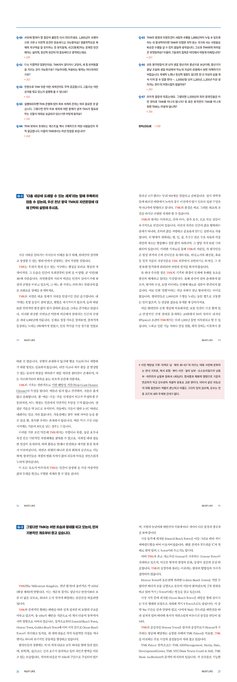 Q-1 ‘다음 세상에 도래할 수 있는 세계’라는 말에 주목하지 않을 수 없는데, 우선 천년 왕국 TMK의 자연환경에 대해 간략히 설명해 주시죠.