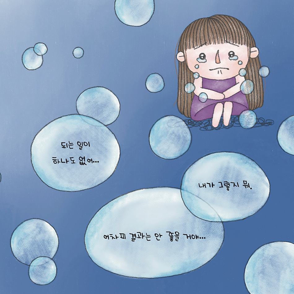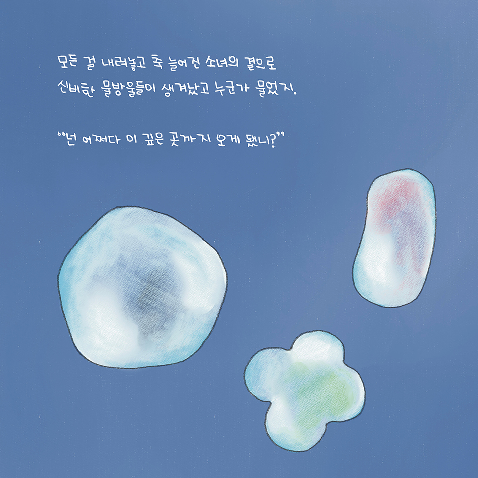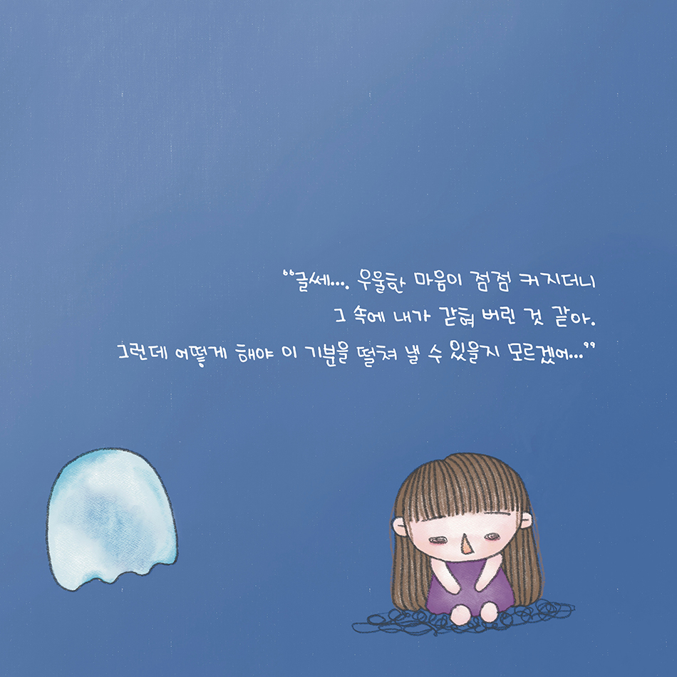 이야기의 주인공인 소녀는 어느 순간부터 쉽게 상처받고 자꾸만 우울해진다. “되는 일이 하나도 없어.” “어차피 결과는 좋지 않을 거야.” 같은 생각들이 머릿속을 떠나지 않는다. 부정적인 생각들은 점점 커져 소녀를 깊은 우울의 바다 속으로 끌어당긴다. 소녀는 그 바다에서 빠져나오려 애쓰지만 어디까지 헤엄쳐도 끝이 보이지 않는다. 결국 지쳐 버린 소녀는 모든 것을 내려놓고 그곳에 가라앉고 만다.