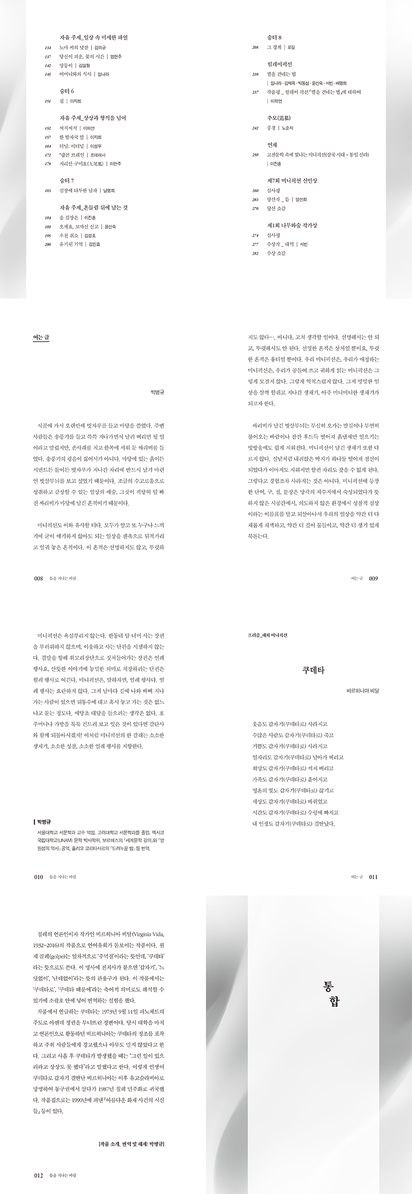 인물 상세 정보한국미니픽션작가회는 짧은 분량 속에 완결된 서사와 깊은 사유를 담아내는 ‘미니픽션’의 대중화와 문학적 위상 정립을 위해 활동하는 작가 단체이다. 2000년대 초반 장르의 개념을 도입한 이래, 매년 동시대의 호흡을 담은 무크지를 발간하며 독창적인 문학 세계를 구축해 왔다. 이번에 발간된 여덟 번째 무크지 『틈을 지나는 바람』 역시 이러한 정기적인 창작 활동의 결실이다.