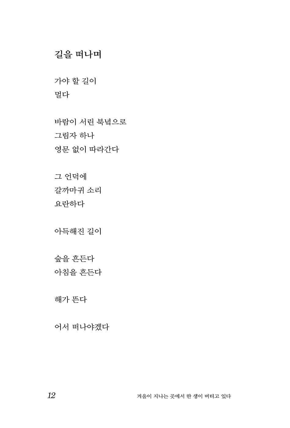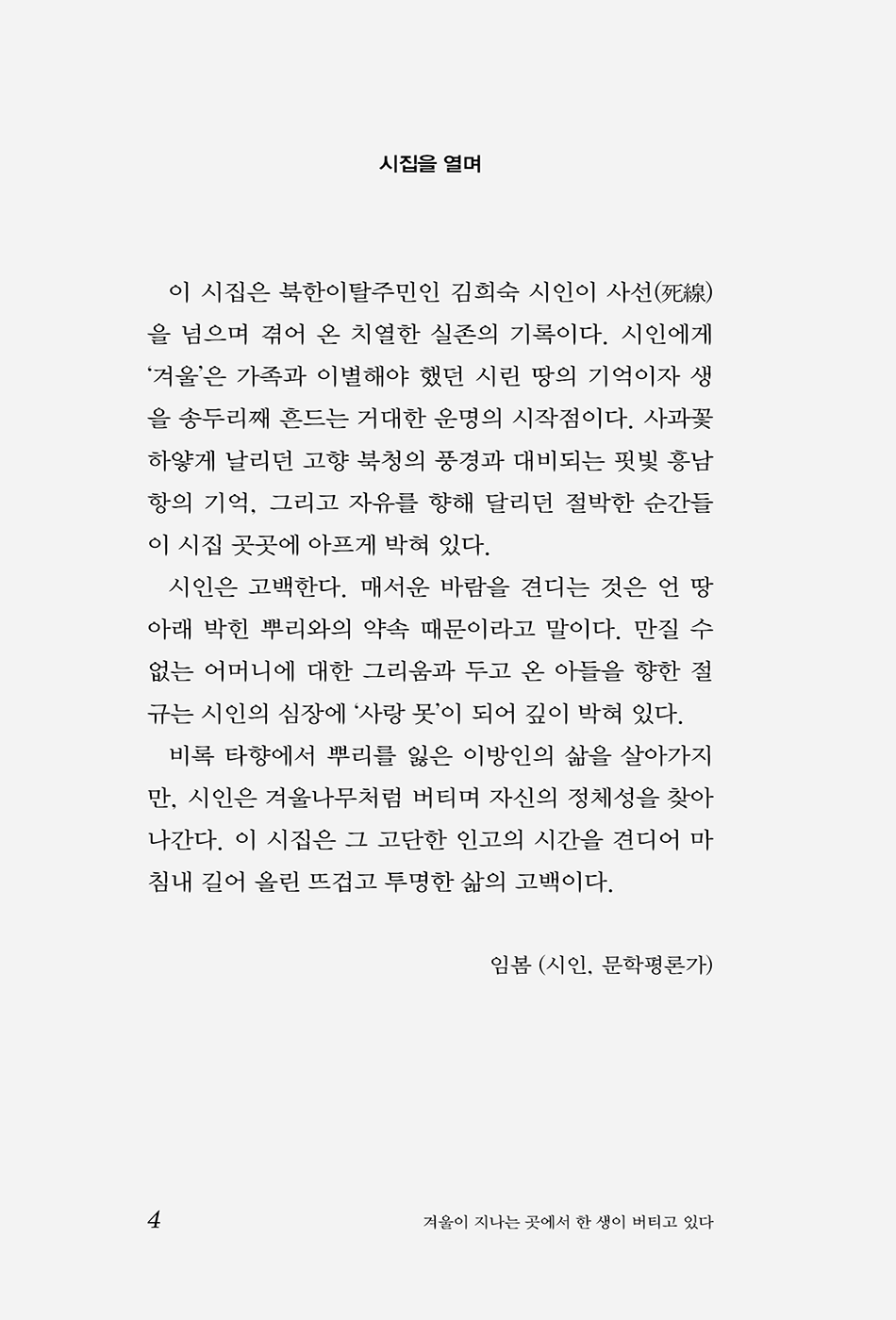 함경남도 북청에서 태어나 사선(死線)을 넘어온 북한이탈주민 김희숙 시인의 치열한 실존적 기록을 담은 시집이다. 시인에게 ‘겨울’은 단순히 추운 계절이 아니라 가족과 이별해야 했던 시린 땅의 기억이자, 생을 송두리째 흔드는 거대한 운명의 시작점을 상징한다. 사과꽃 하얗게 날리던 고향 북청의 풍경과 대비되는 핏빛 흥남항의 기억, 그리고 자유를 향해 달리던 절박한 순간들이 시편 곳곳에 아프게 박혀 있다.
