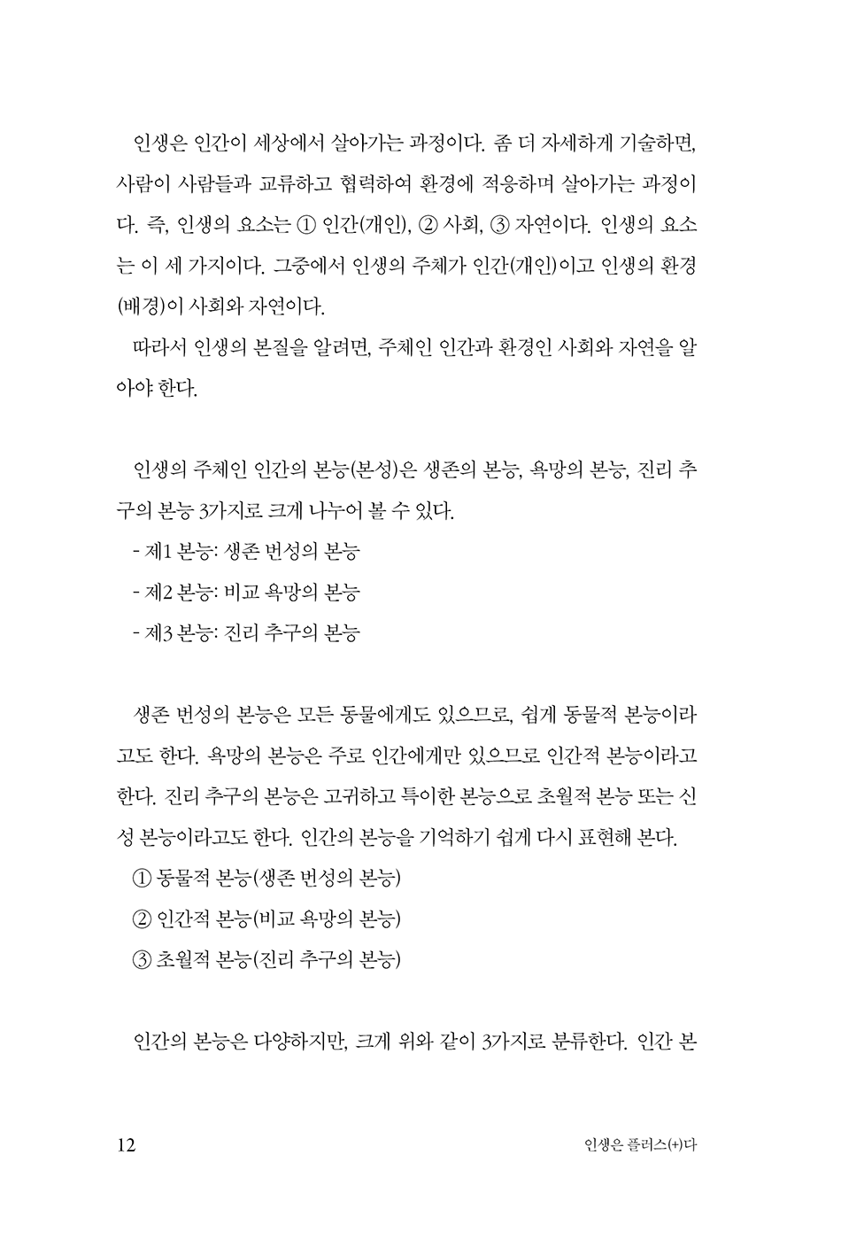이 책은 인간의 삶을 ‘나·사회·자연’이라는 세 가지 요소로 나누고, 생존·욕망·진리라는 세 가지 본능을 중심으로 인생의 구조를 체계적으로 풀어낸다. 또한 인생의 목적과 목표, 행복과 불행, 문제 해결 방식, 그리고 ‘어떻게 살아갈 것인가’에 이르기까지 삶의 전반을 아우른다. 저자는 어려운 철학 이론 대신, 누구나 이해할 수 있는 언어로 인생을 설명하며 “삶의 기본 안내서”를 제시하고자 한다. 인생을 미리 공부하고 준비할 수 있다면, 우리는 더 많은 기회를 보고 더 나은 선택을 할 수 있다는 믿음에서 출발한 책이다.