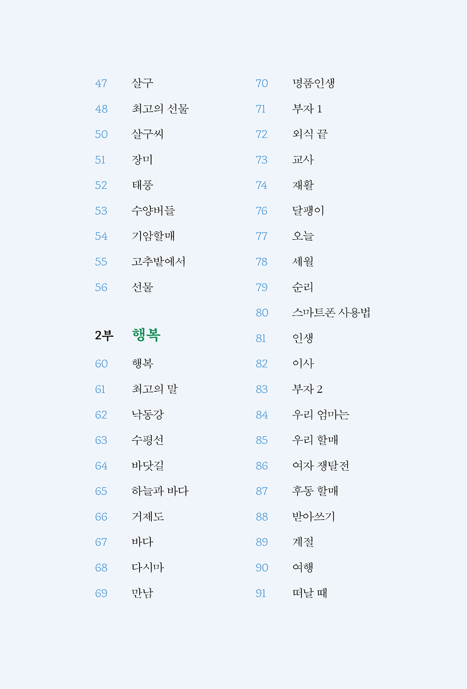인물 상세 정보새벽에 일어나 하얀 별처럼 곱게 내린 감꽃으로 목걸이를 만들었다. 아무도 모르게 소복이 내린 감꽃을 모아 면류관을 엮었다. 감꽃은 머리 위에 꿈처럼 반짝였고, 배고픈 아이들의 음식이 되었다. 고향 집 마당에서 보았던 꽃과 나무, 산과 들에서 놀던 추억들이 몇 편의 시가 되었다. 사랑하는 가족과 이웃에게 『감꽃』이 작은 선물이 되었으면 좋겠다.