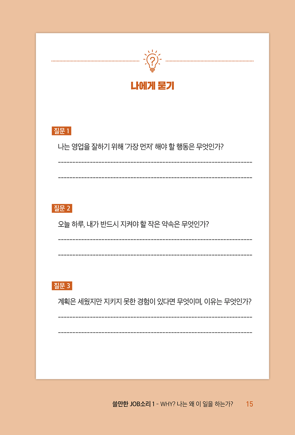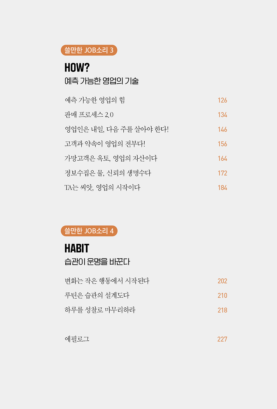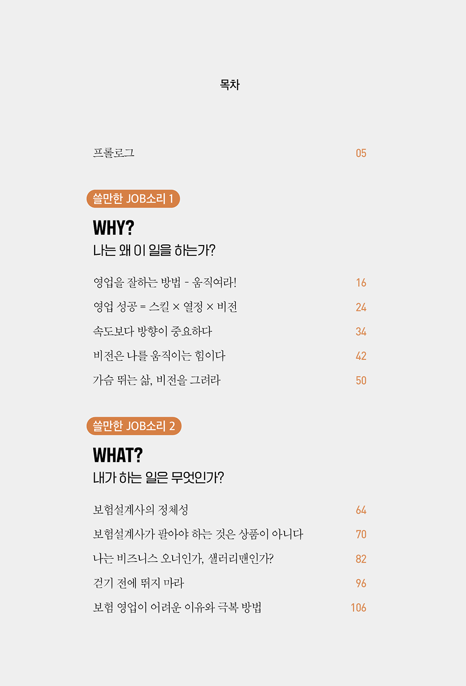 《보험꼰대의 쓸만한 JOB소리》는 28년 보험 영업 현장에서 축적된 경험을 바탕으로, ‘성과를 만드는 영업의 본질’을 행동 중심으로 풀어낸 실전 가이드다. 이 책은 화려한 이론이나 기술보다, 실제 현장에서 바로 적용 가능한 단순하고 명확한 원칙을 제시한다. 책은 WHY(왜 하는가), WHAT(무엇을 하는가), HOW(어떻게 하는가), HABIT(어떻게 지속하는가)라는 구조로 구성되어 있다. ‘왜’라는 질문에서 출발해, 영업의 본질과 정체성을 이해하고, 이를 실행 가능한 행동과 습관으로 연결한다. 특히 “성과는 결심이 아니라 구조에서 나온다”는 메시지를 중심으로, 예측 가능한 영업 시스템을 만드는 방법을 구체적으로 제시한다.