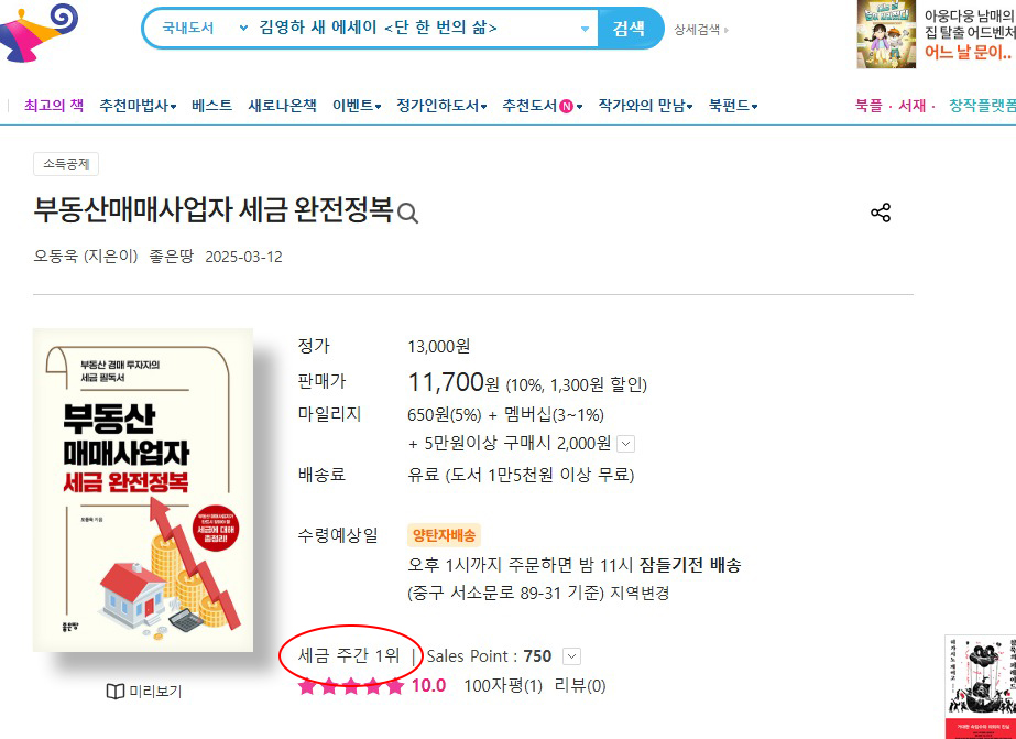‘부동산매매사업자 세금 완전정복’이 알라딘에서 1위를 기록했습니다.