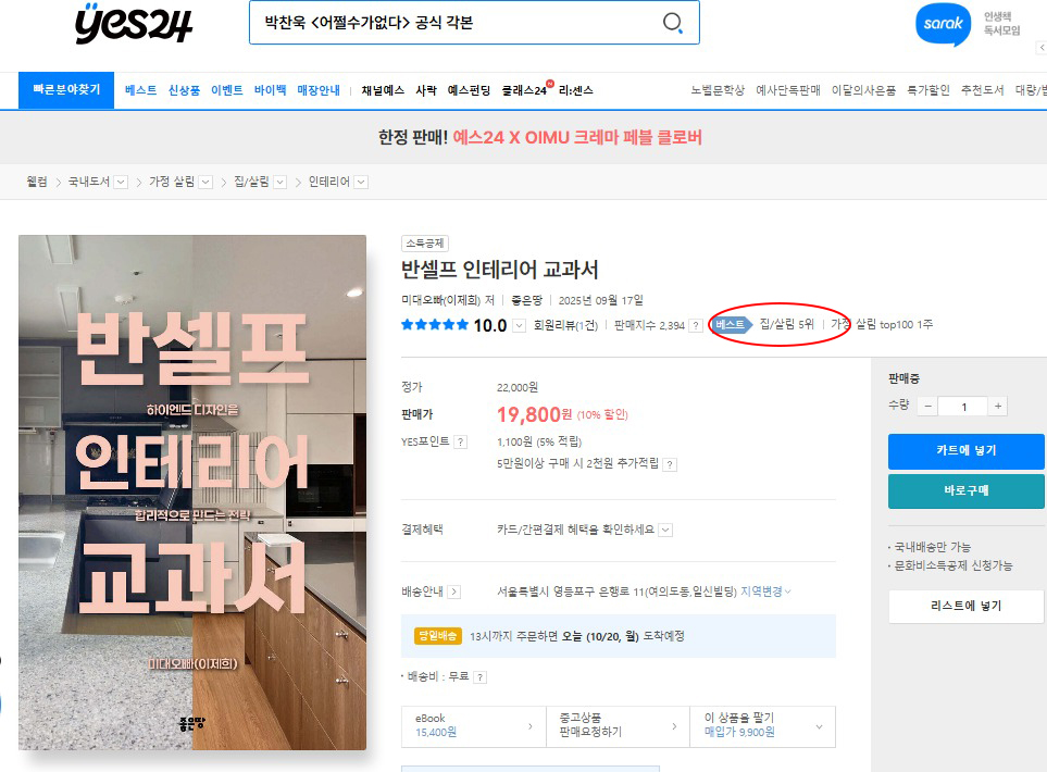 ‘반셀프 인테리어 교과서’가 YES24에서 5위를 기록했습니다.