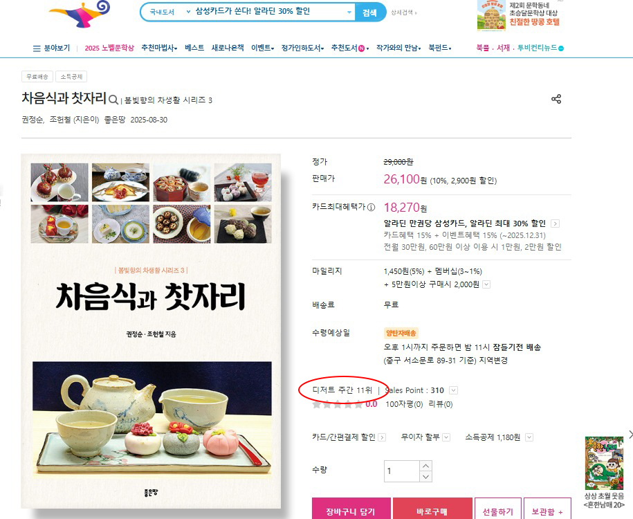 ‘차음식과 찻자리’가 알라딘에서 디저트 11위를 기록했습니다.