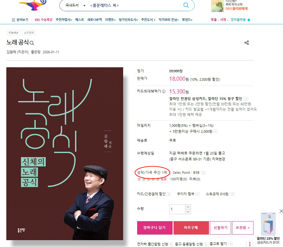 ‘노래 공식’이 알라딘에서 성악/가곡 1위를 기록했습니다.