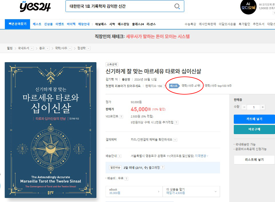 ‘신기하게 잘 맞는 마르세유 타로와 십이신살’이 YES24에서 역학/사주 47위를 기록했습니다.