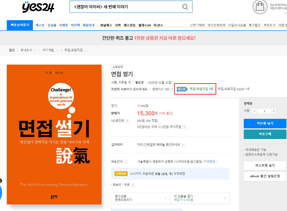‘면접썰기’가 YES24에서 취업/유망직업 3위를 기록했습니다.